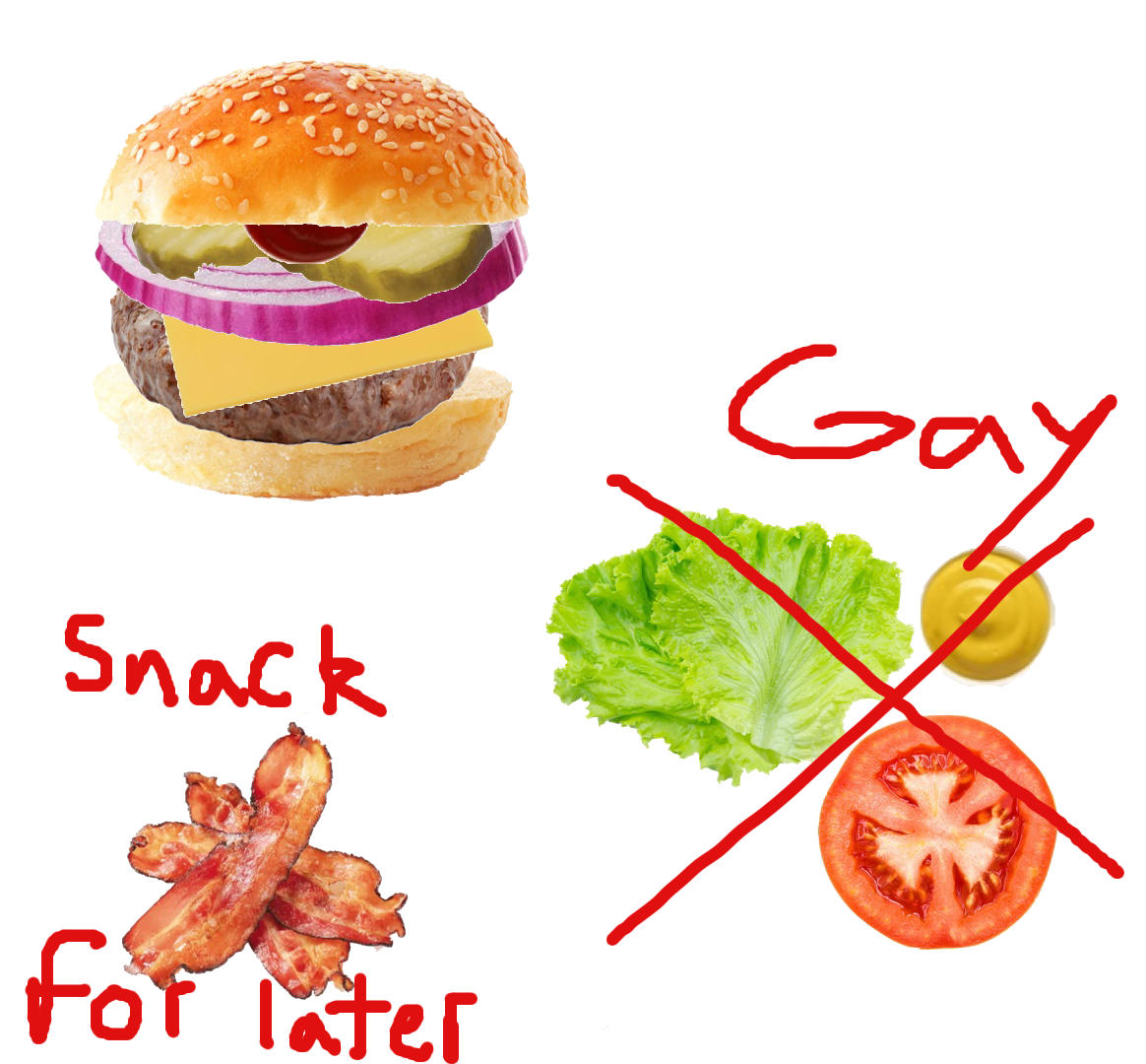 >>21659798bun'chupburgercheesetomatoonionmustardbunBacon is eaten separately and pickles and lettuce go in the trash.