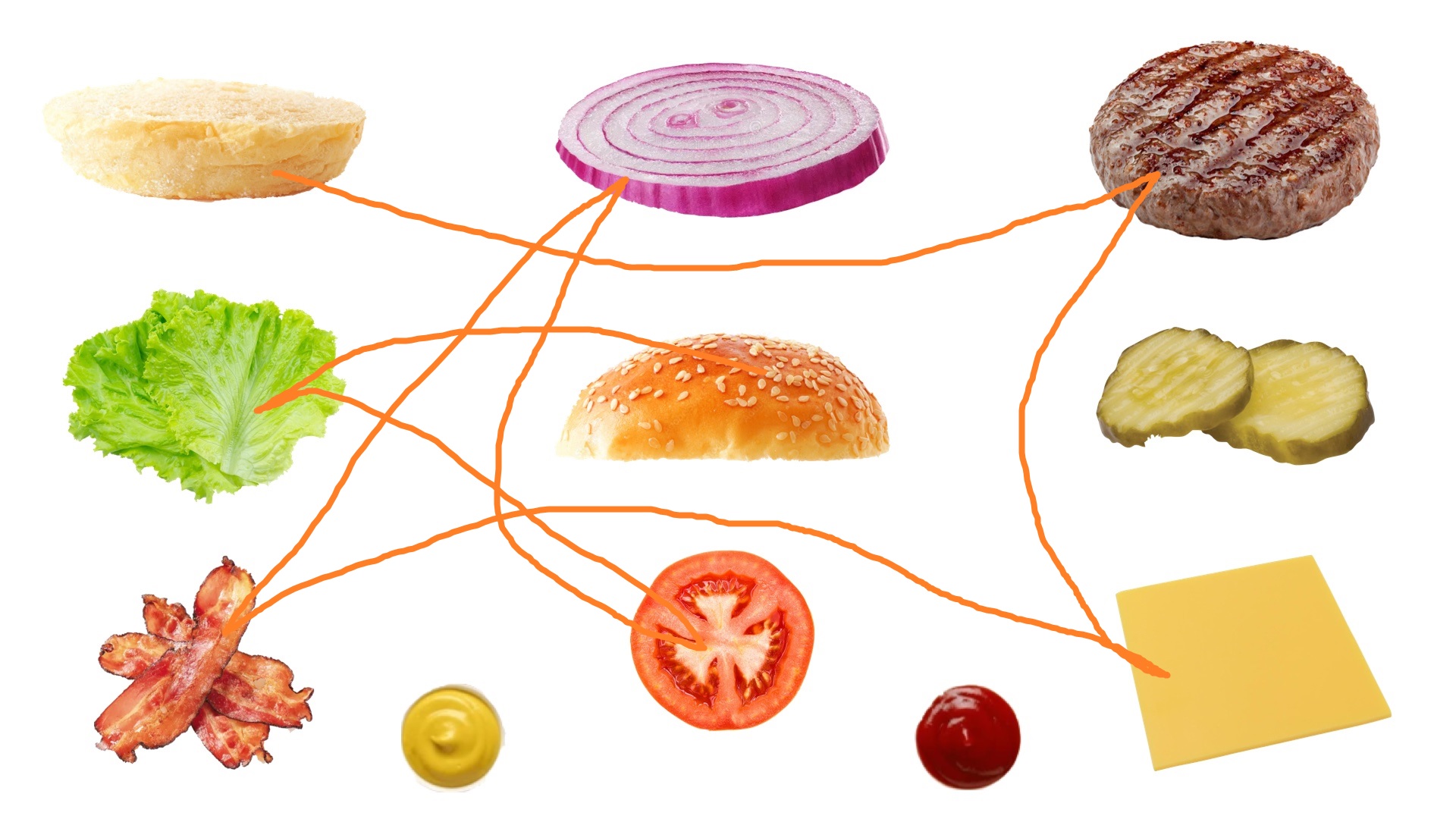 >>21659798Sandwich 1 Bun Mustard Tomato Bacon Onion CheeseSandwich 2 Bun Ketchup Pickle Patty Lettuce
