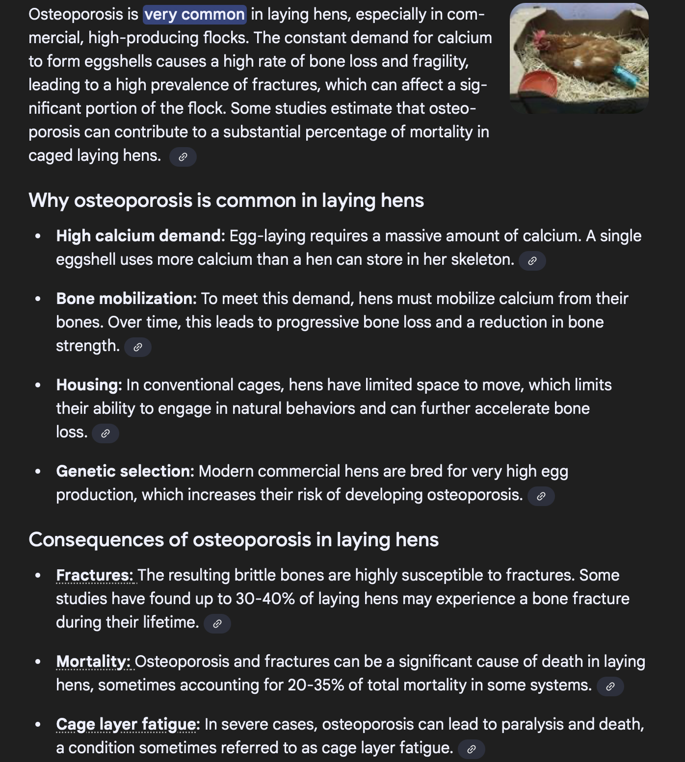>>21670961I mean it's an actual thing you can google in 10 seconds. https://poultrydvm.com/condition/avian-osteoporosishttps://pmc.ncbi.nlm.nih.gov/articles/PMC7926946/https://www.sciencedirect.com/science/article/pii/S003257911941585X>Being an animal useful to man is also one hell of a succesful niche to be in.I wouldn't call being forebly bred and being a slave to humans before being killed at a quarter of your lifespan a "success".