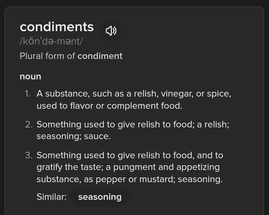 >>21672907Salt isn't a condiment, you fucking retard.