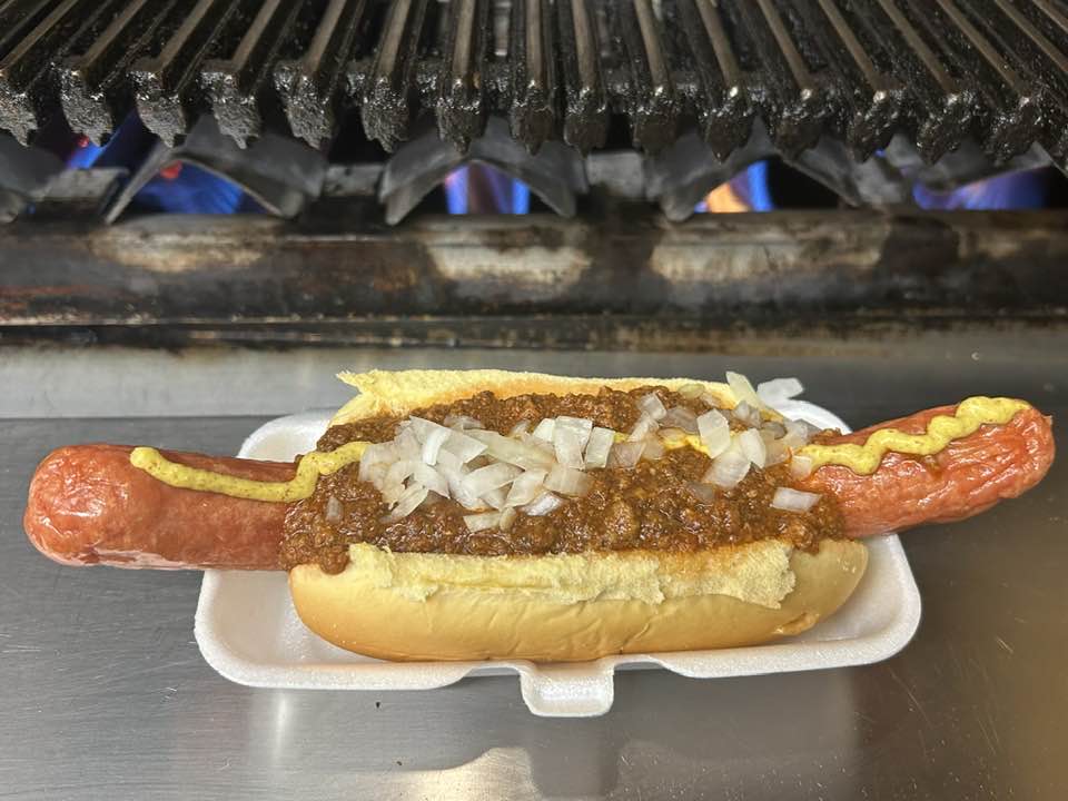 >Quarter pound hotdog on a potato roll with chili mustard and onion at Cubbysâs barbecue Hackensack New Jersey