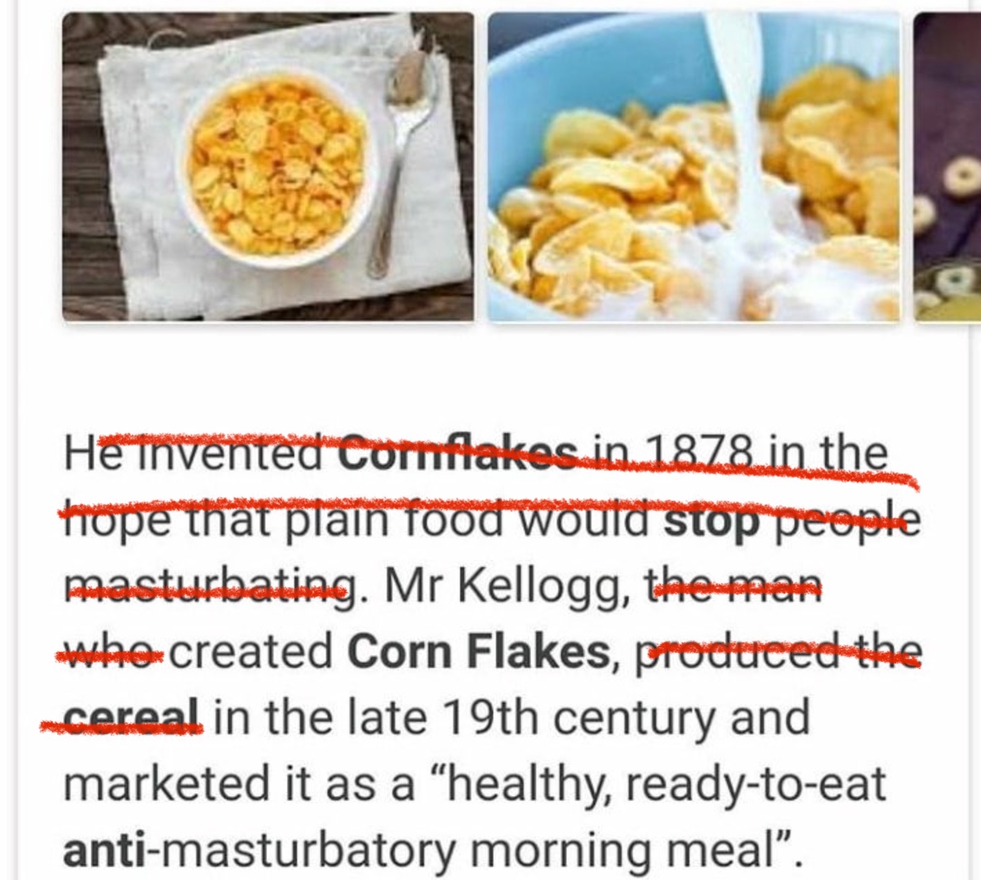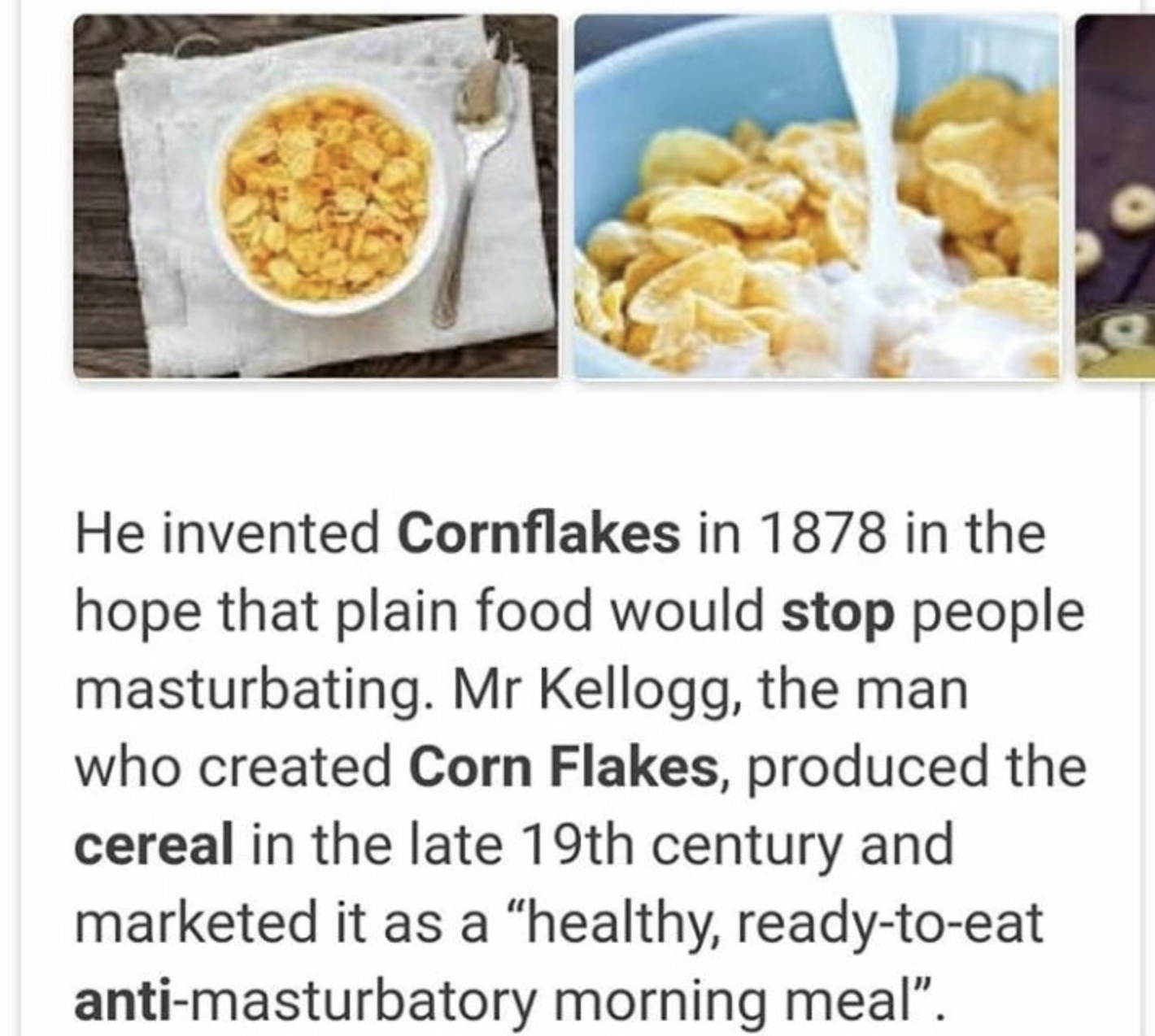 >>21755845FAKE! it's a true fact mixed with bullshit, Kellogg said that about GRANOLA, not corn flakes, it was Kellogg's brother the one who marketed corn flakes and he didn't give a fuck about masturbation, just making money with his cereal. this is one of those fact that get degraded because of tv, like how people think male lions don't hunt.