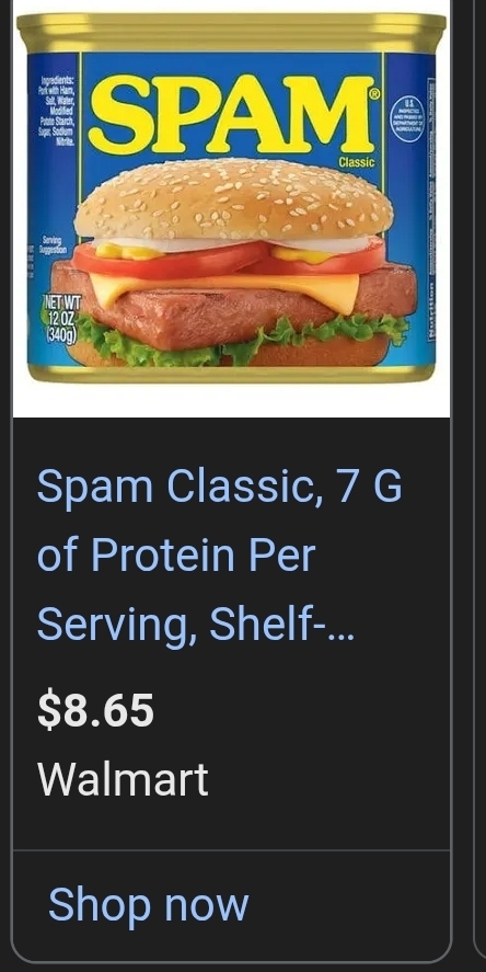>>21778088nægrœ a 340g (12oz) can of spam costs AU$6 but is on sale for like $4 half the year. I don't understand how it could be almost US$9 at Whalmart, that just makes no sense
