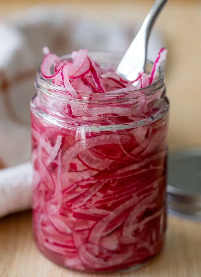 Whats the best recipe for quick pickled red onions? Do you add sugar to your brine? whats the vinegar proportion to water? thinly sliced onions or thicker cuts? do you add any spices besides salt?