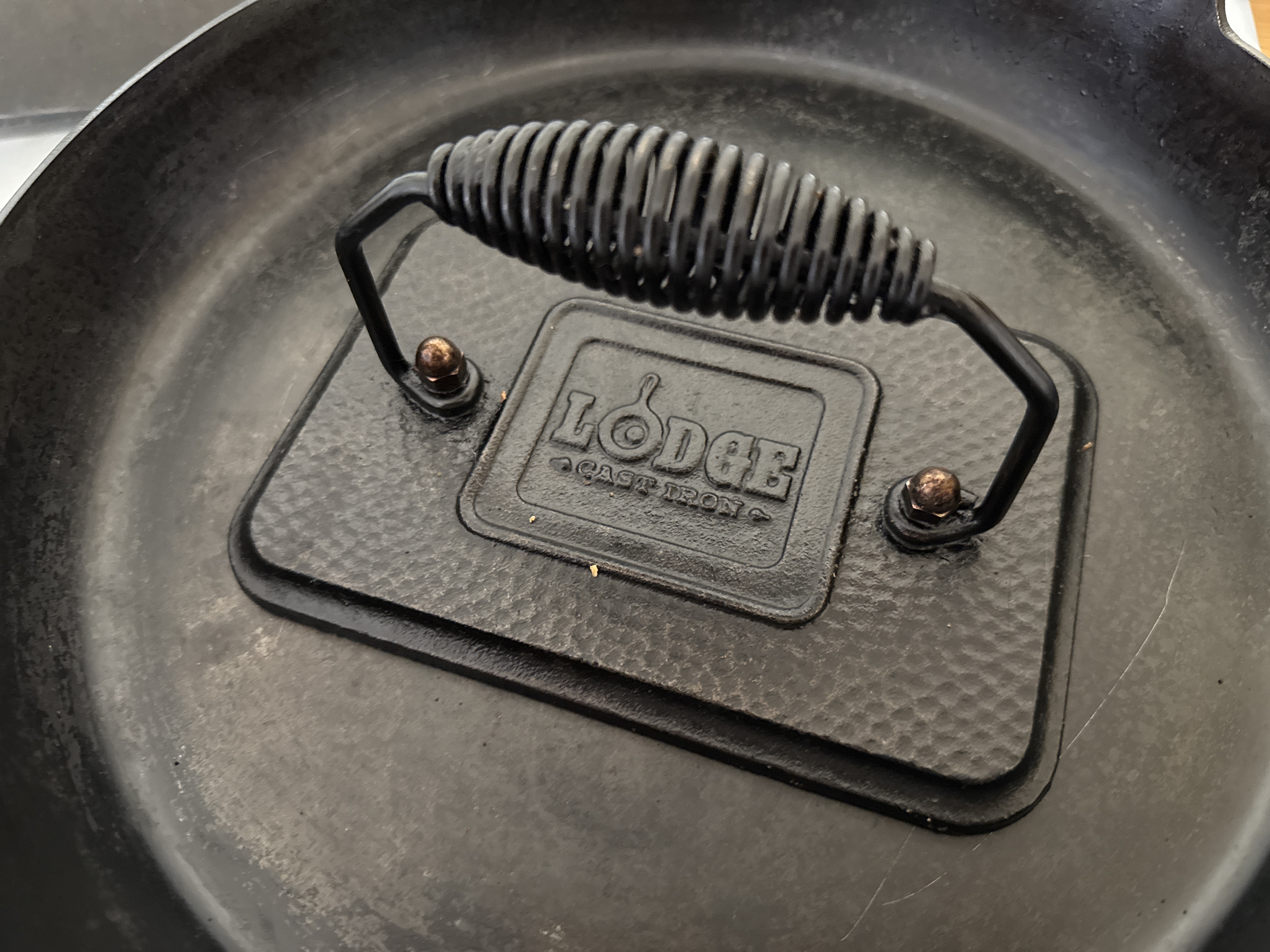 >>21793607I dry age my steak and still find a weight is useful. I don’t keep it on for the full sear, I just gently press the steak into the pan for about 30 seconds to make sure the entire surface has good contact. It works for me>>21793435Hate this one, the handle looks awful. I use a Lodge.