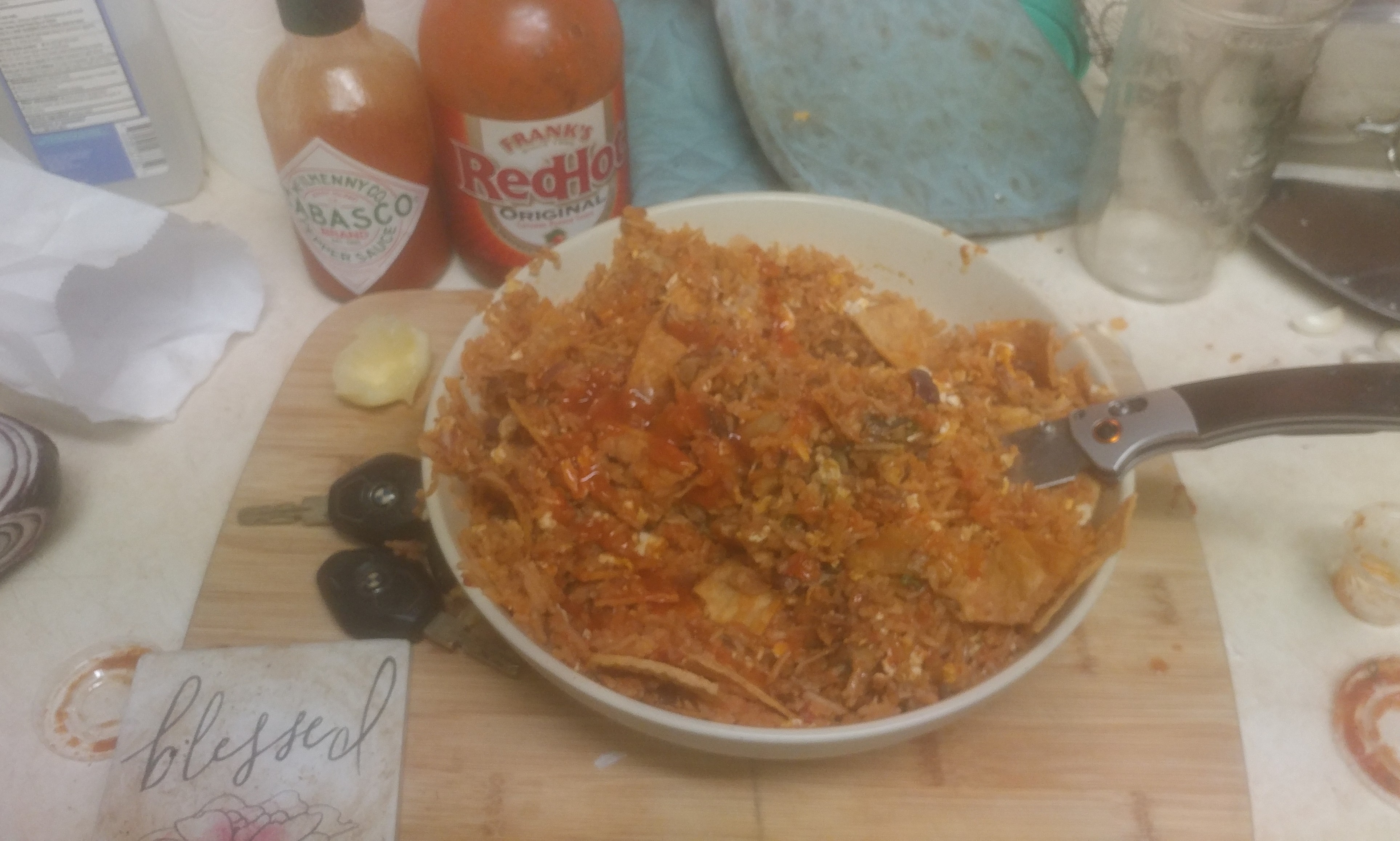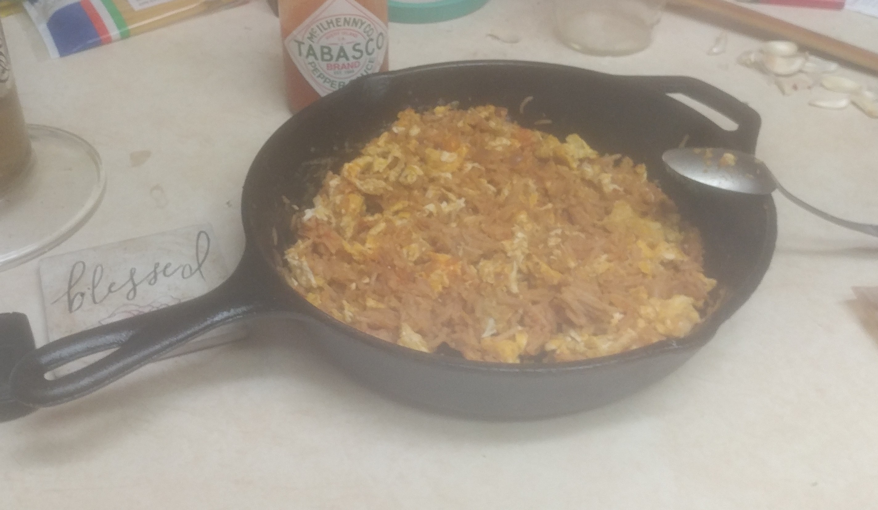 Tonight is me pre-dindinz, 3 eggie fry rye from leftover arroz rojo y a splash of TABASCO