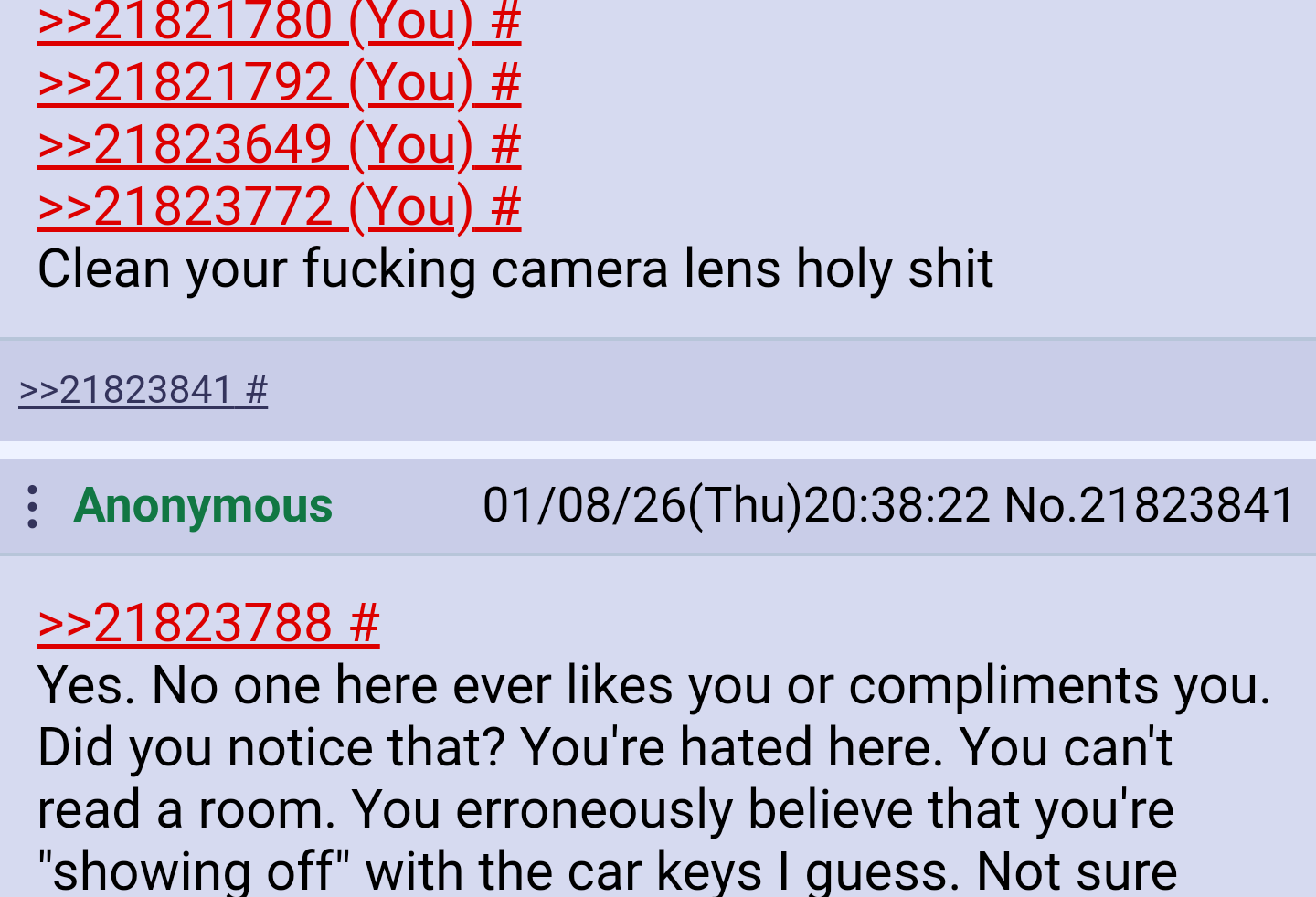 >>21819217This. >>21819691You're so easily triggered, OP. And then you just double down like you're not embarrassing and cringe. But you go out of your way to deliberately troll everyone. You just lean even harder into what you know people will give you shit for. And that's just sad. That's what the kids without dads did in adolescence at school. I hope you find a new way.