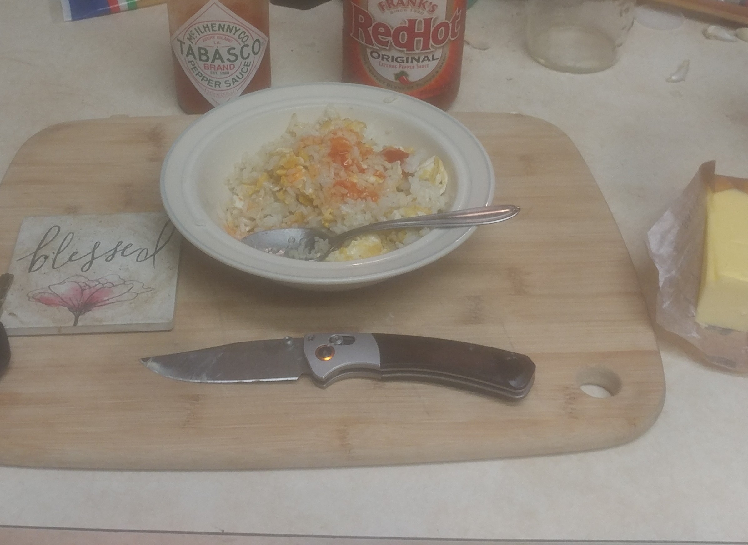 Tonight is me pre-dindinz:One-eggie basmati fry rye, with three (3) splashes each of TABASCO and FRANK'S RedHot