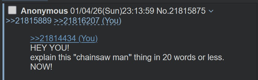 >>21814434HEY YOU!explain this "chainsaw man" thing in 20 words or less.NOW!