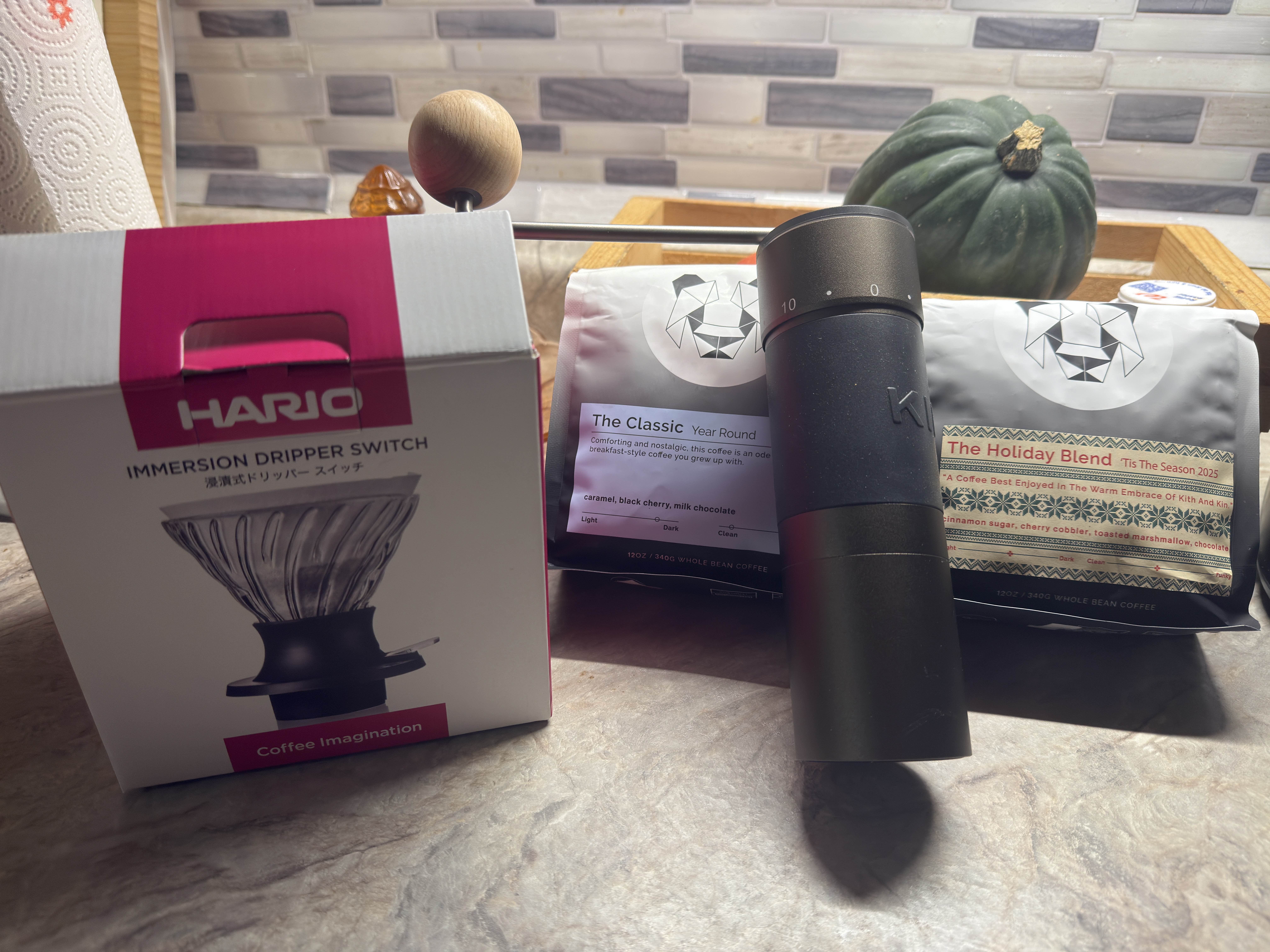>KinGrinder K6>Hario V60 Switch>Black/White Coffee beansLove my coffee setup, maximum comfy