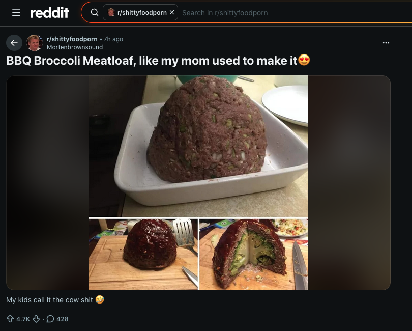 >reddit reddit redditSHUT UP I just want to see the pic of a broccoli in a meatloaf, take a fucking break from the internet