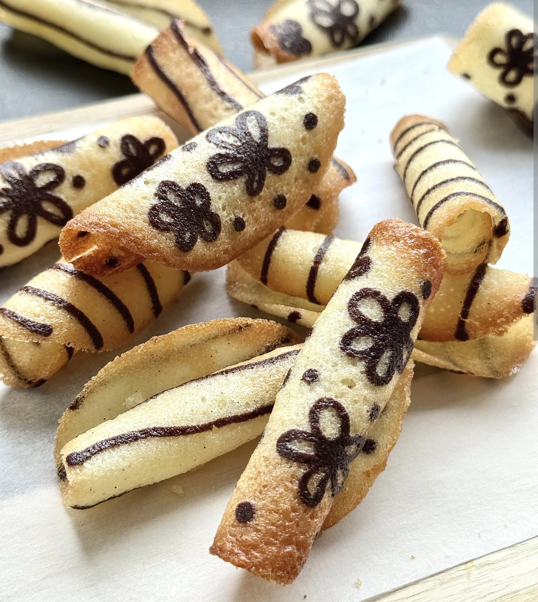 Tuile cookie, you can make it at home. Shape them while they're still warm out of the oven, they're pliable. When they cool, they hold their shape. Make some fun shapes! Like dongs!