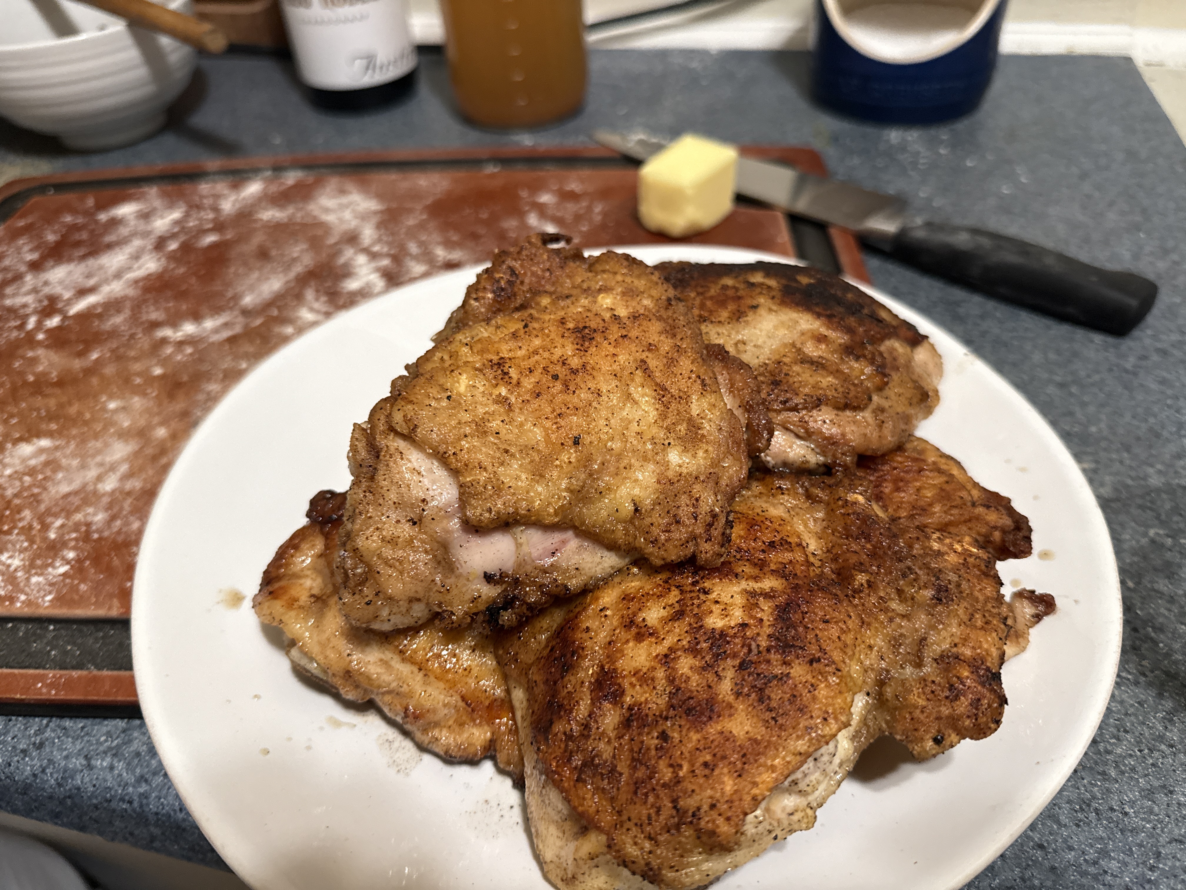 the chicken was dredged in flour, garlic powder, salt, pepper and a little cayenne, and now its going to fry in butter.