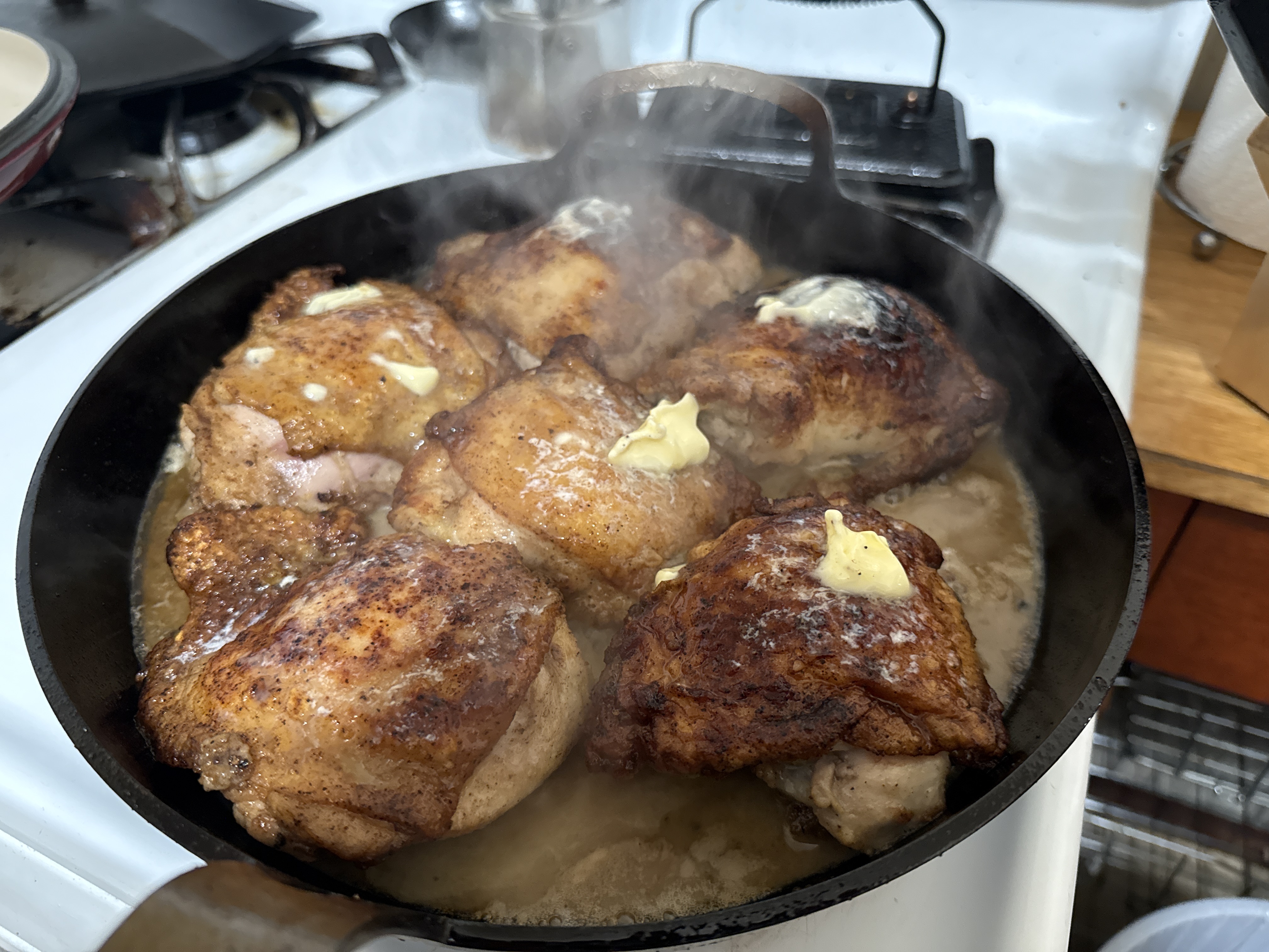 I deglazed the pan with wine, cooked it down, added broth, then added the chicken back, and put butter on top.