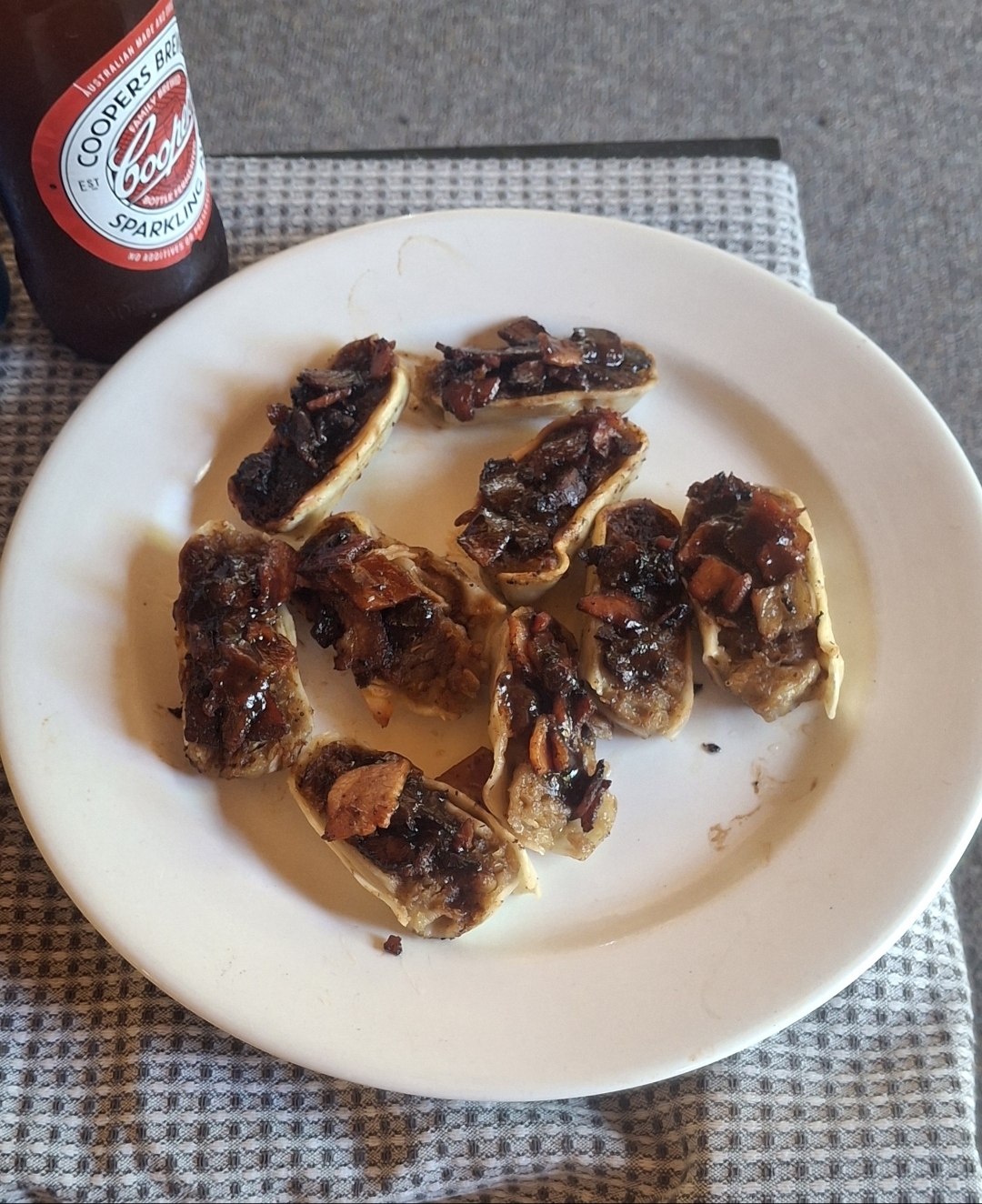 >steamed marathon dimmies>dice and fry bacon>halve then fry dimmies>prepare kila sauce (worcestershire, tomato sauce, tobasco)>assemble and put under grillWa la!