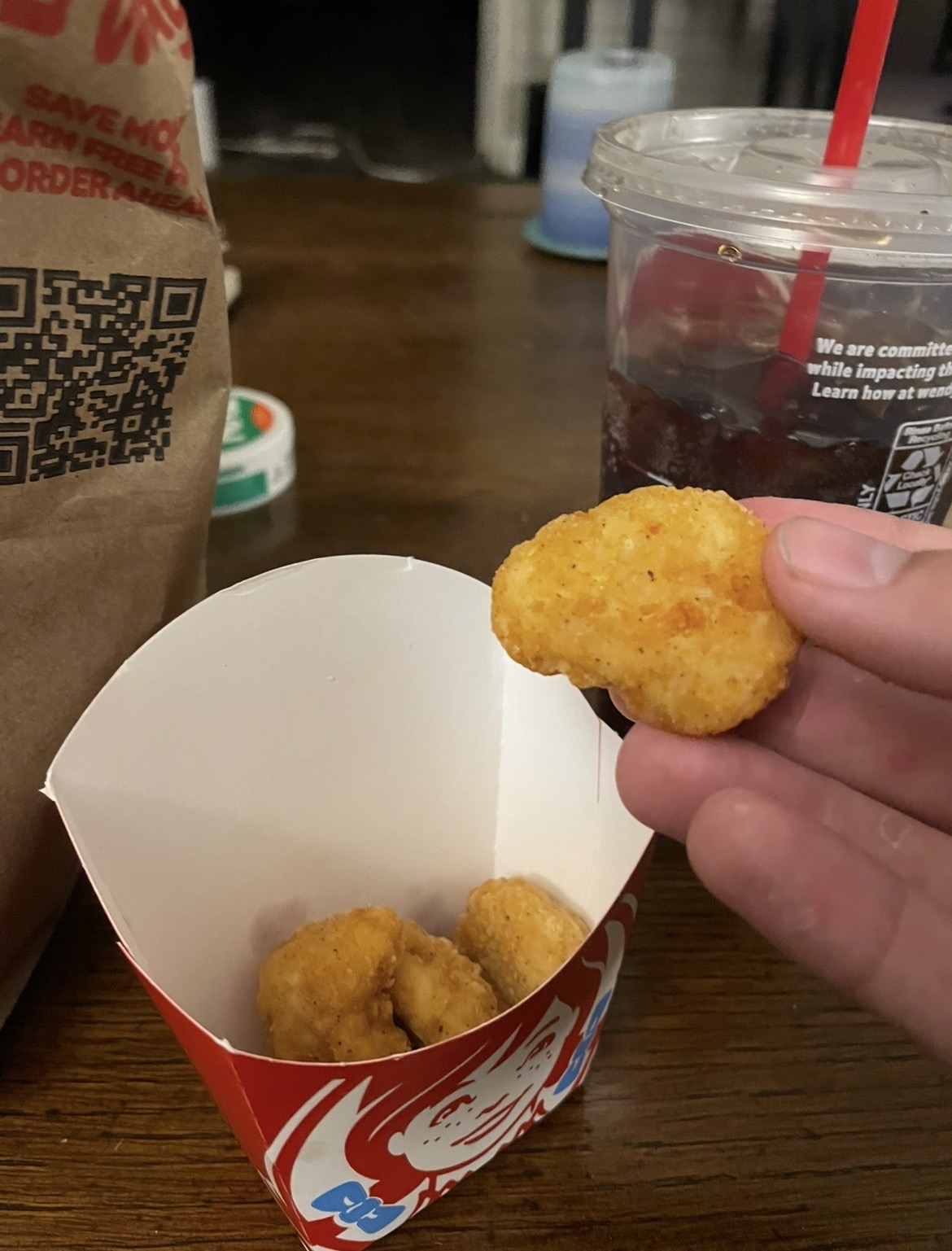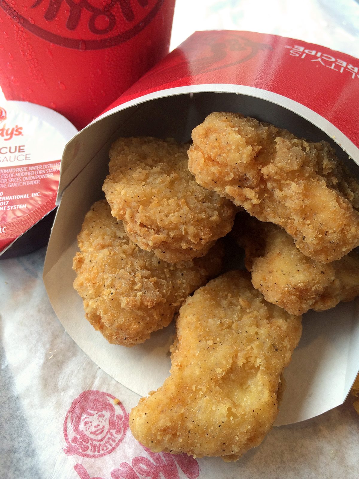 This is a 4 piece nugget at Wendy’s now. I haven’t eaten one yet. The container came this empty. They have appeared to keep the price the same ($6.54 for a double stack biggie bag in the Midwest) by turning the chicken nuggets into bites. Wake up, America. This is what they took from you. Our precious nuggie wuggies