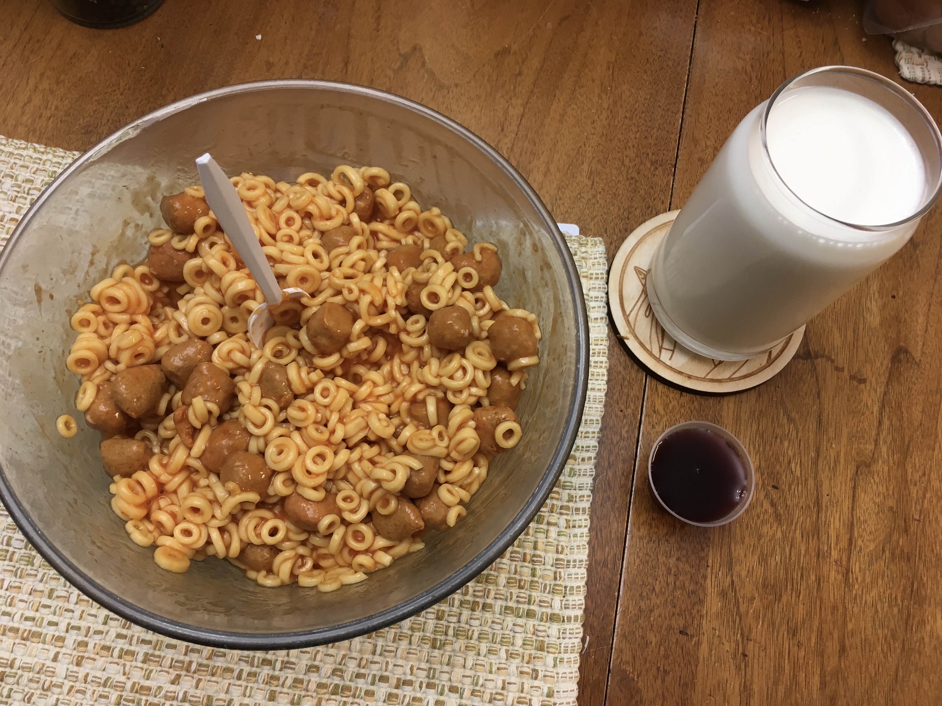 >>21821502>3 cans of spaghettios (strained)>glass of milk>shot of grape juiceyup, its dinner time