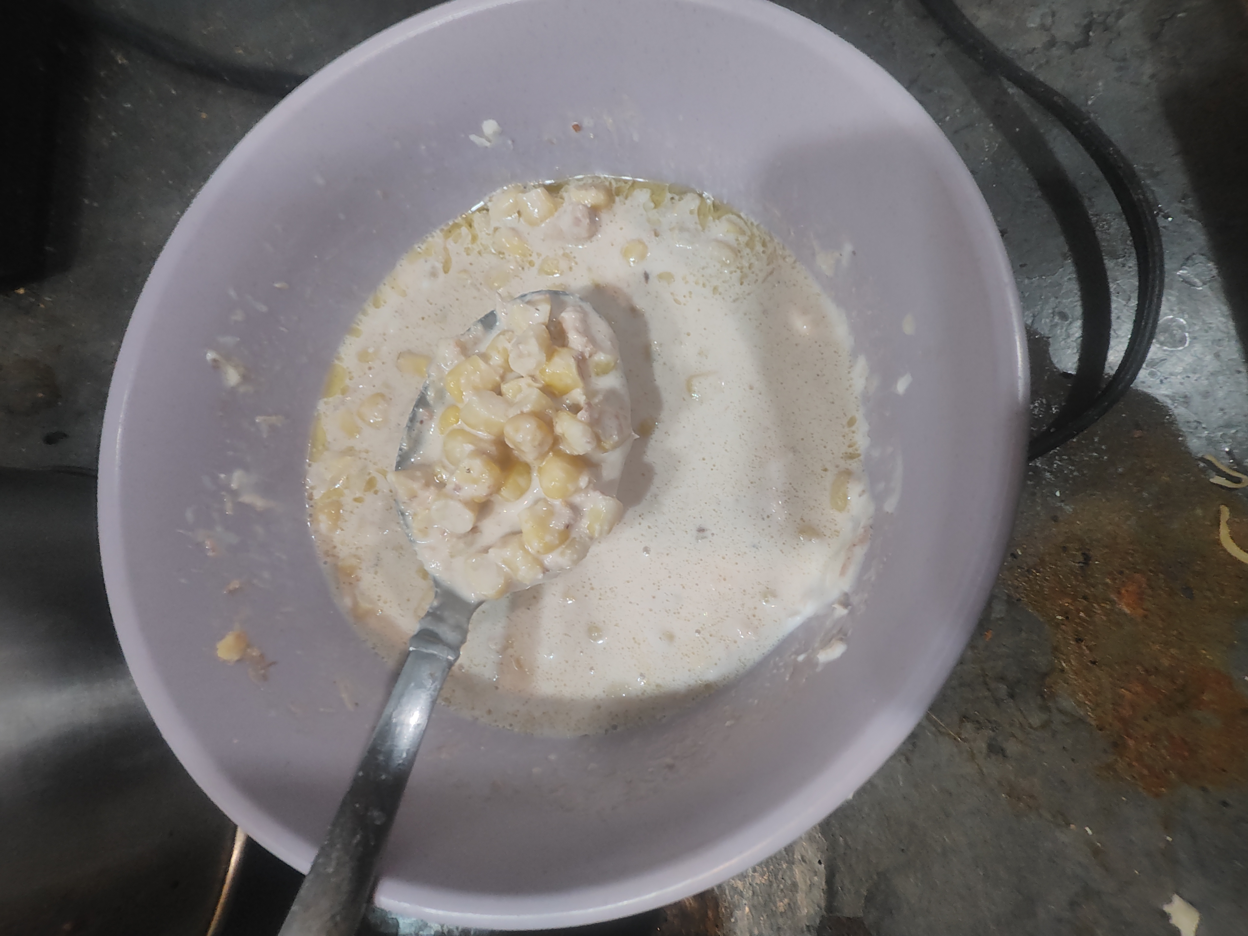 >can of tuna>can of corn>quarter-half cup idk of sour cream>soy sauce>dash of warsistershyer sauce>dash of hot sauce>olive oil from the can of sardines I had on the sideWallah! We eatin good tonight bros