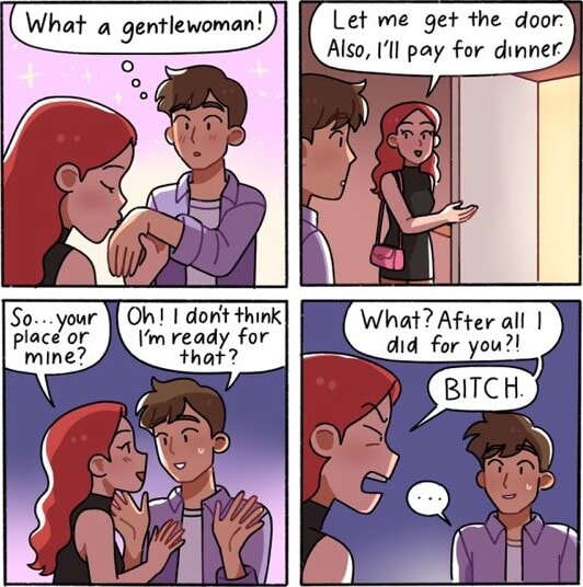 >>21831406You can be interested in someone and not ready to have sex. Just hire an escort instead of treating random people like one via paying for dinner lol.