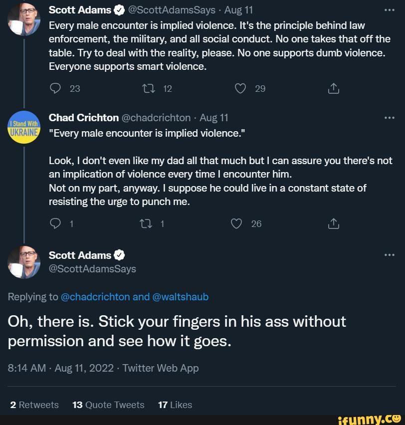 >>21831485>>21831466>>21831476Like most things with Adams there is a teeny tiny grain of truth in his hilariously poorly-delivered ramblings.The state is a monopoly on force, and fundamentally all agreements between OPPOSED parties are backed up by the threat of violence. A law that threatens imprisonment or death is a threat, and a law that only fines someone is only a law for the poor. If you and I have a contract and you absolutely refuse to hold up your end, my ultimate recourse is the courts' promise of violence at the end of decades of litigation.Scott didn't say any of that.Scott said ALL MALE INTERACTION is based on violence, as though talking to my dad is the same kind of interaction as entering into a contract and requires an underlying promise of force. What he said was fucking stupid.