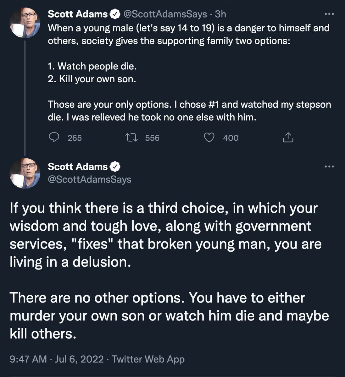 >>21831499Are you german? You seem to have trouble with hyperbole Scott here does not mean you should murder your son. This is classic reddit taking the absolute worst interpretation of anything and not making any allowance for a man grieving the overdose death of his son. This is why social media is so horrible