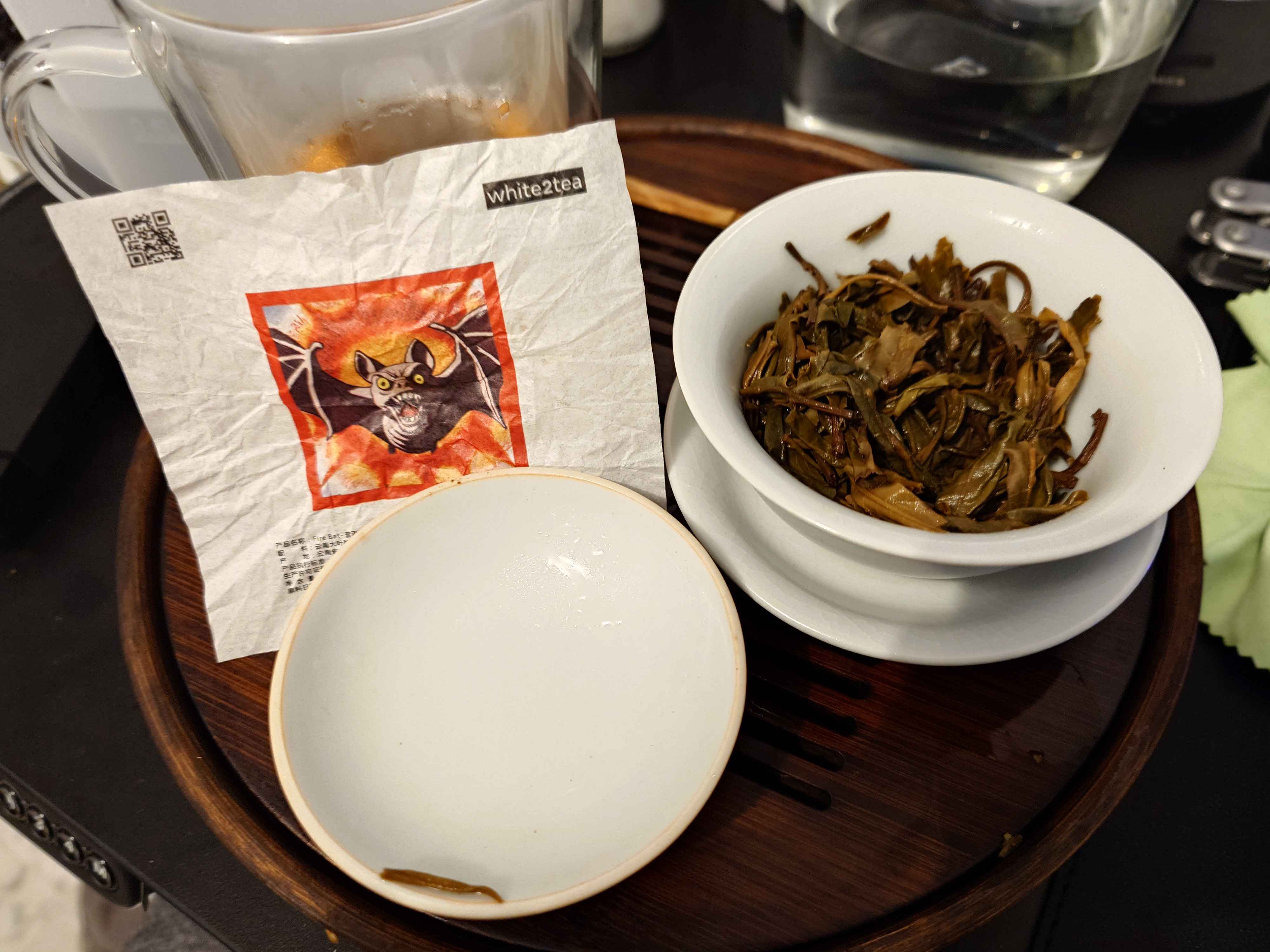 Firebat from white2tea, a smoked raw puer. It is really smoky, smells a bit like burnt rubber. The description mentions cigar/tobbaco, which describes this tea quite well. Not bad but for very short steeping only I'd say, beyond 30sec the bitter is not really enjoyable