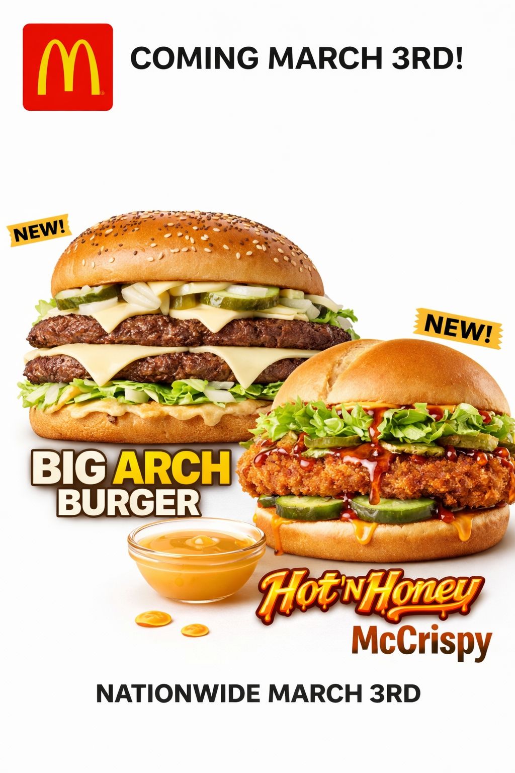 McD Manager hereTHe Hot Honey line up starts on Tuesday (stores have the option to soft sell right now too)The Big Arch is coming in March. Ask me anything, Reddit