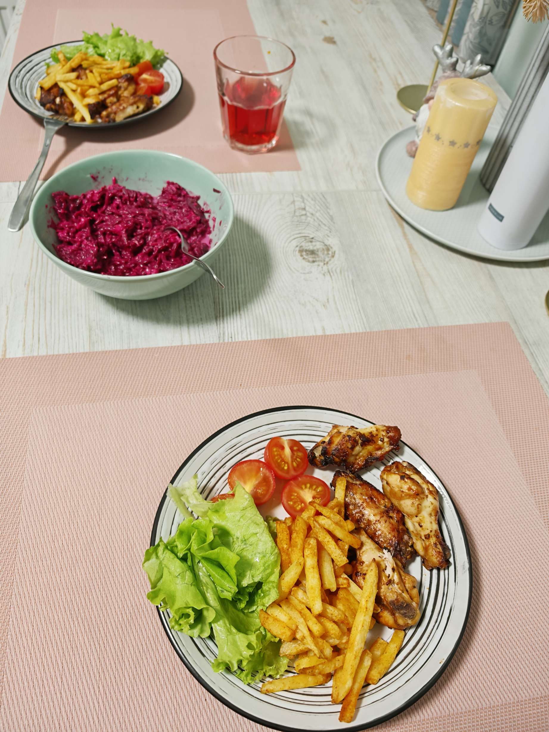 >>21852787>Is this ok?NOFor a number of reasons. The wings are a finger food and you would be constantly wiping your hands before you get to your knife and fork for the other items. The lettuce looks Ok, not a flavourless Iceberg type and if the tomatoes are decent, then that looks Ok too. Although If they are American, they have no flavour. The cardboard sticks (Americans call them French Fries) look awful as well. The beetroot just as well be on the plate with the other bits. In short - it's just a mish-mash of stuff on a plate.
