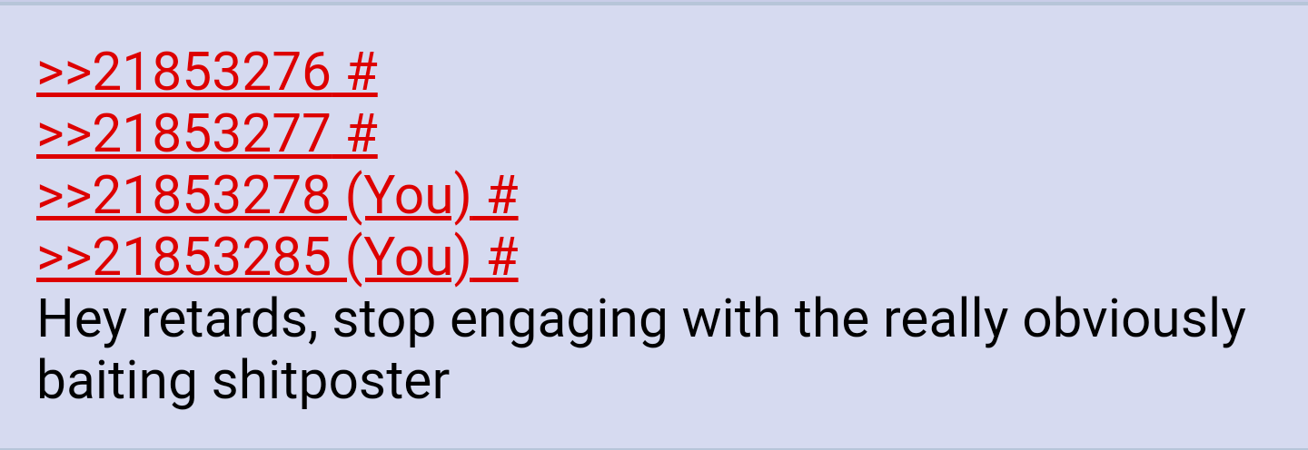 >>21853276>>21853277>>21853278>>21853285Hey retards, stop engaging with the really obviously baiting shitposter