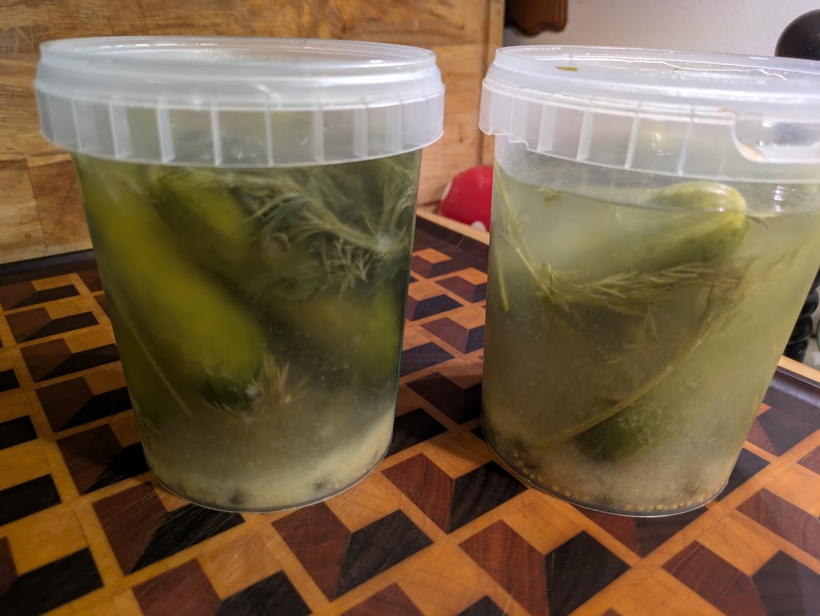 >>21855108>>21855742dont put your fingers inside, use fork or something, because bacteria from your fingers will spoil it withing days instead of weeksfermented cucumbers are safe to store for a month or longer even in room temperature, but it is always preferred to keep them in some cold, they are harder to spoil than you think, even if brine smells you can wash them in a clean water and taste, but if brine smells, you cant expect them to last fine for another month, throw them or eat within day or two, if they still taste fine