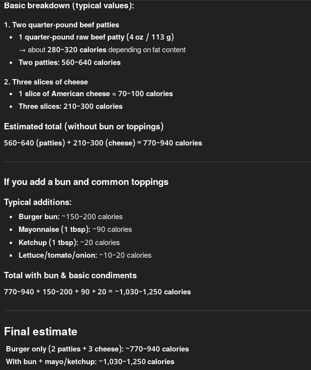 >>21879677It's two quarter-pound patties, plus three slices of cheese, and sauce on both buns. How would it not be 1000 calories?