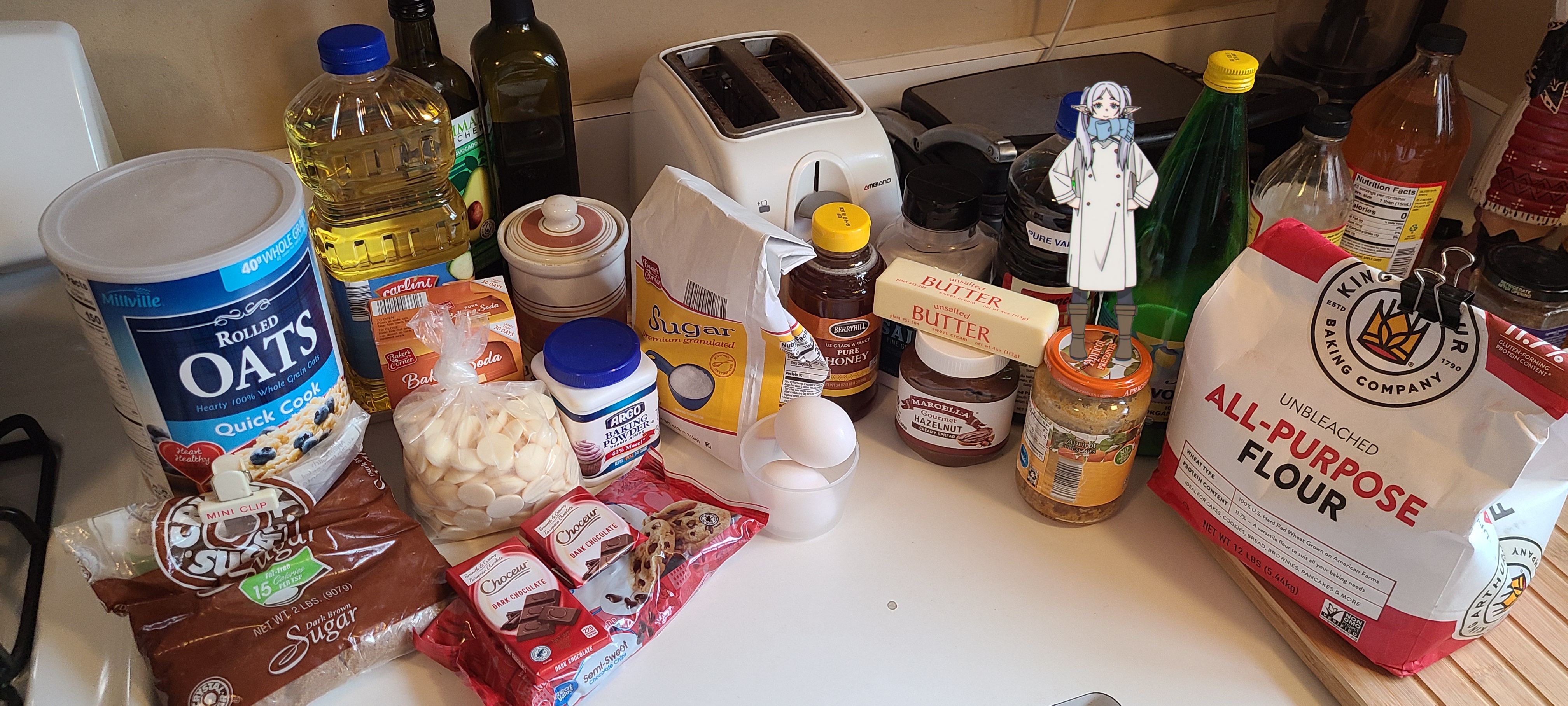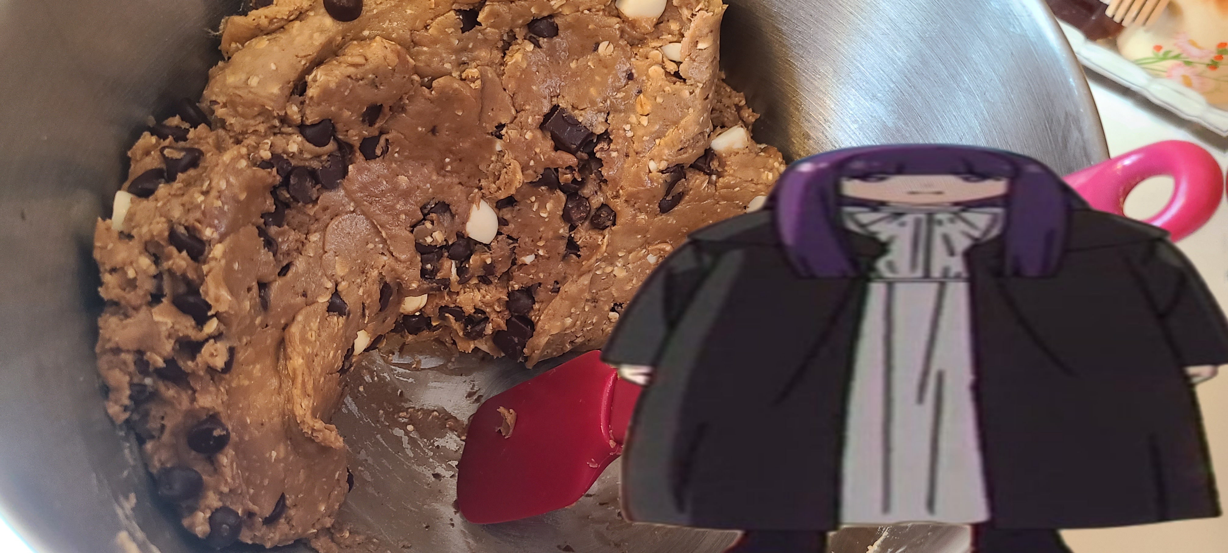 Tomorrow is Frieren Friday, also known as Fat Fern FridayThus, I am making cookies today!Overall recipeCOOKIES>1.5 cups dark brown sugar>.5 cups gran sugar>1 stick of butter>dash of salt>1 tbsp vanilla extract (can use vanilla sugar, instead)>1 tbsp spoon of honey>some lemon and orange zestMIX all together until creamy, then incorporate>2-3 eggs depending on size>small spoon of half baking soda half baking powder, activated with lemon juice extract>2.5 flour>dash of veg oil>.5-1 cup of oats>1 cup chocolate chips (plus some extra white chocolate chips)>1.5 bars of chocour dark chocolate or bagged dark chocolate chunks>refrigerator, a whole one>bake at 320ish for around 15-20 min