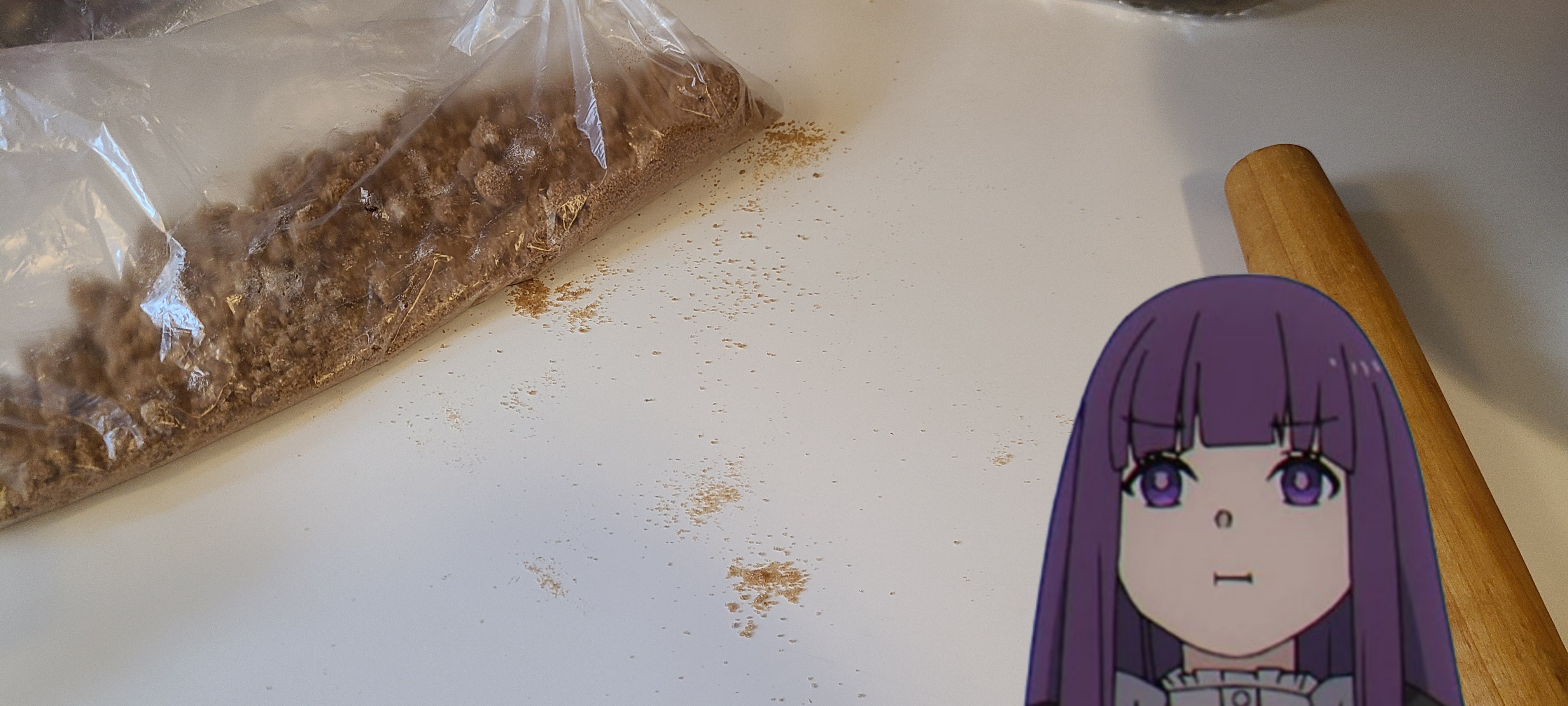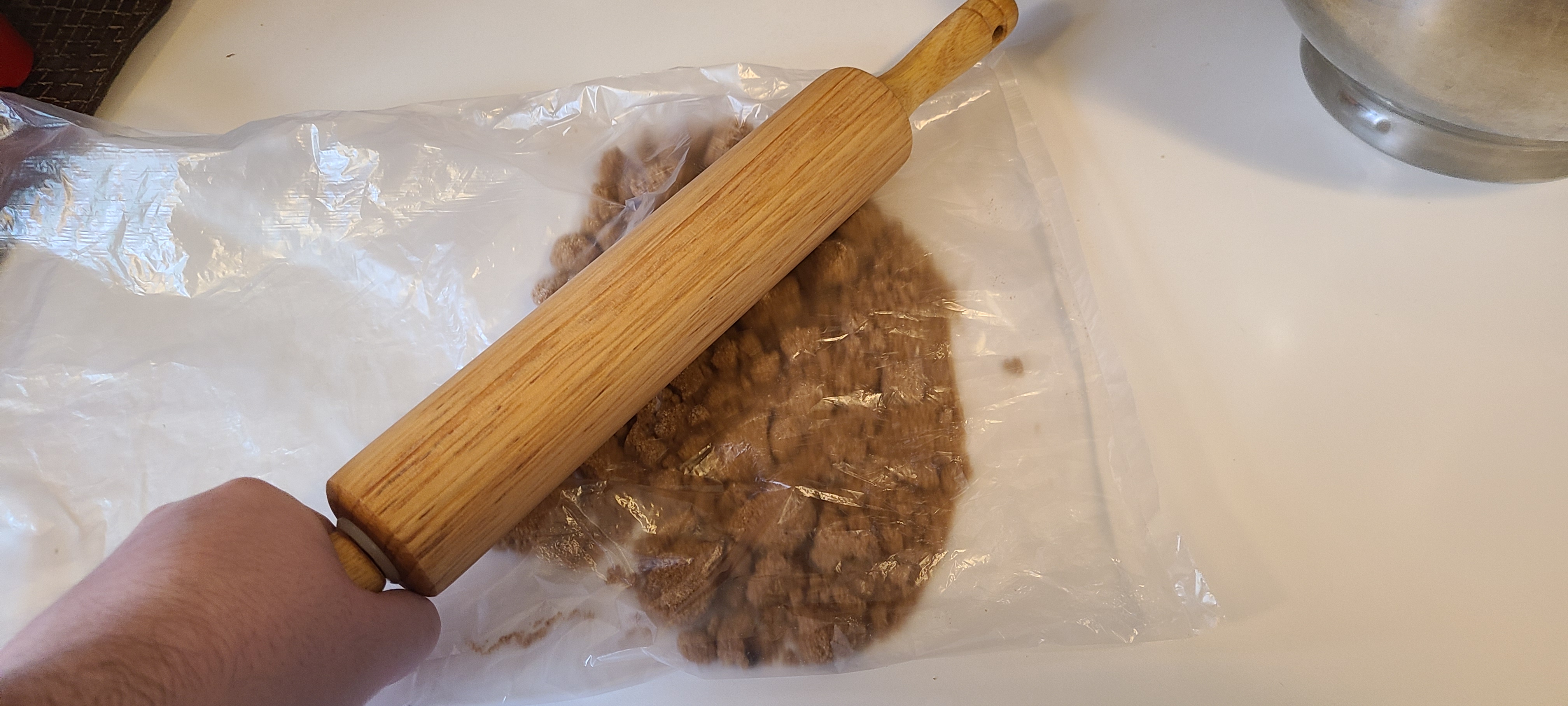 Smashing it with a rolling pin was a mistake and I knew it was going to be a mistake but I did it anywaysAtleast the big chunks were crushed