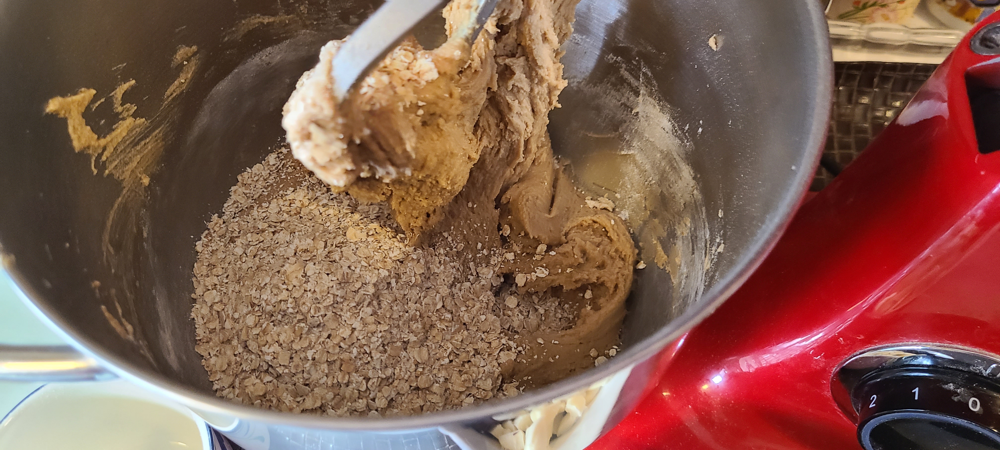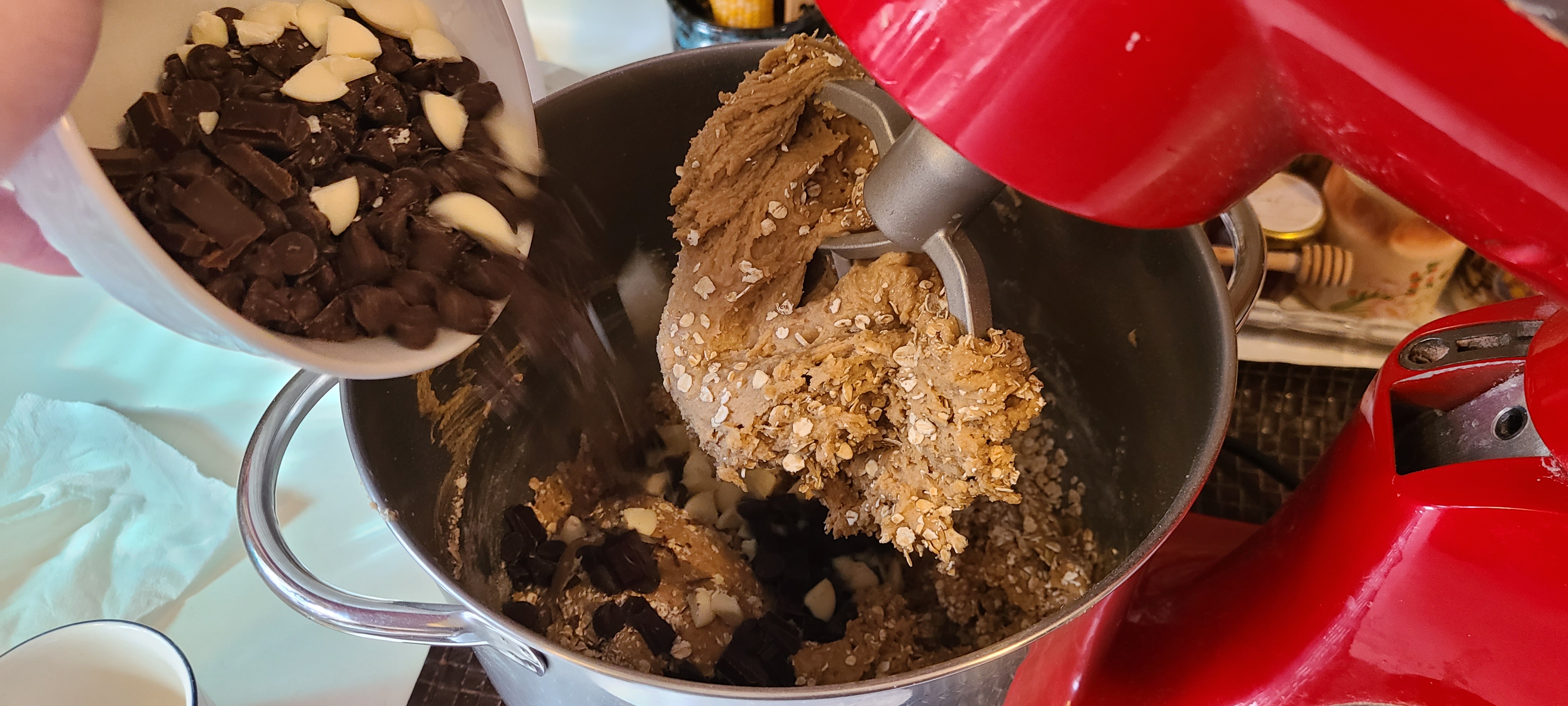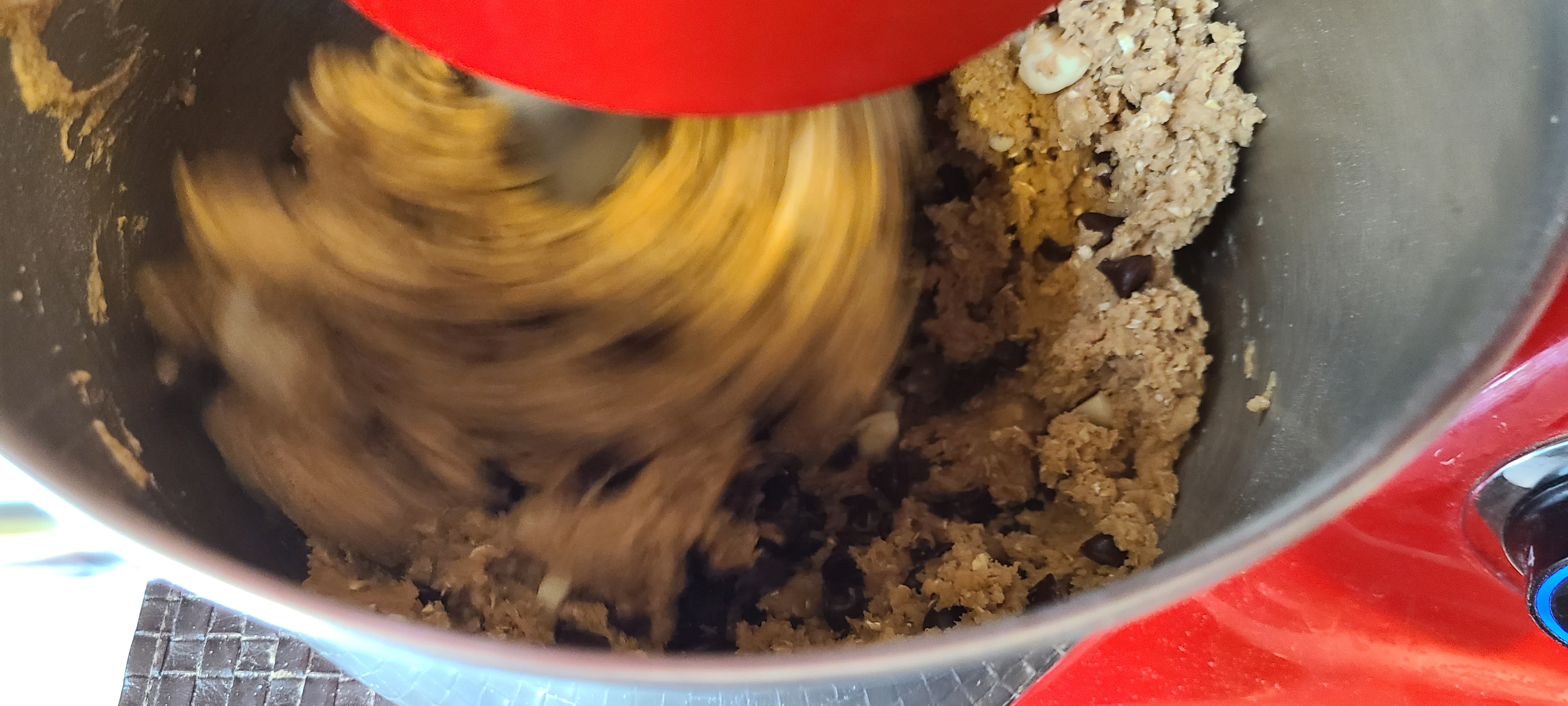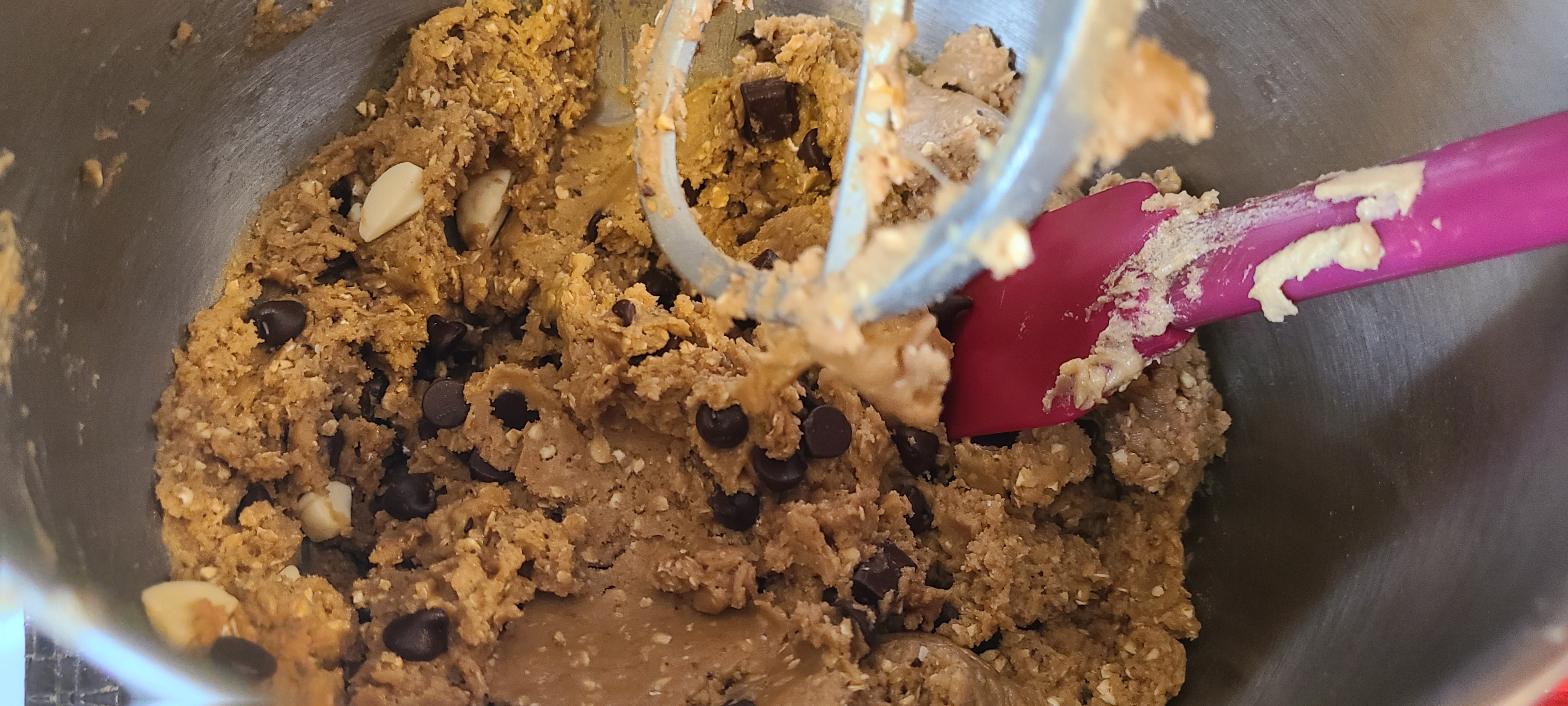 Incorporate the chocolate on low speed. I took it out of the mixer and mixed it in with a silicone spoon afterwards, as the paddle left a ton of choco chips on the bottom of the bowlLooking back, this composition is fine, but there was either a little too much flour or oats, which made it a little bit too solid, and thus it turns out a tad too dense in the end. Less of either or both of those would have resulted in a better texture in the end