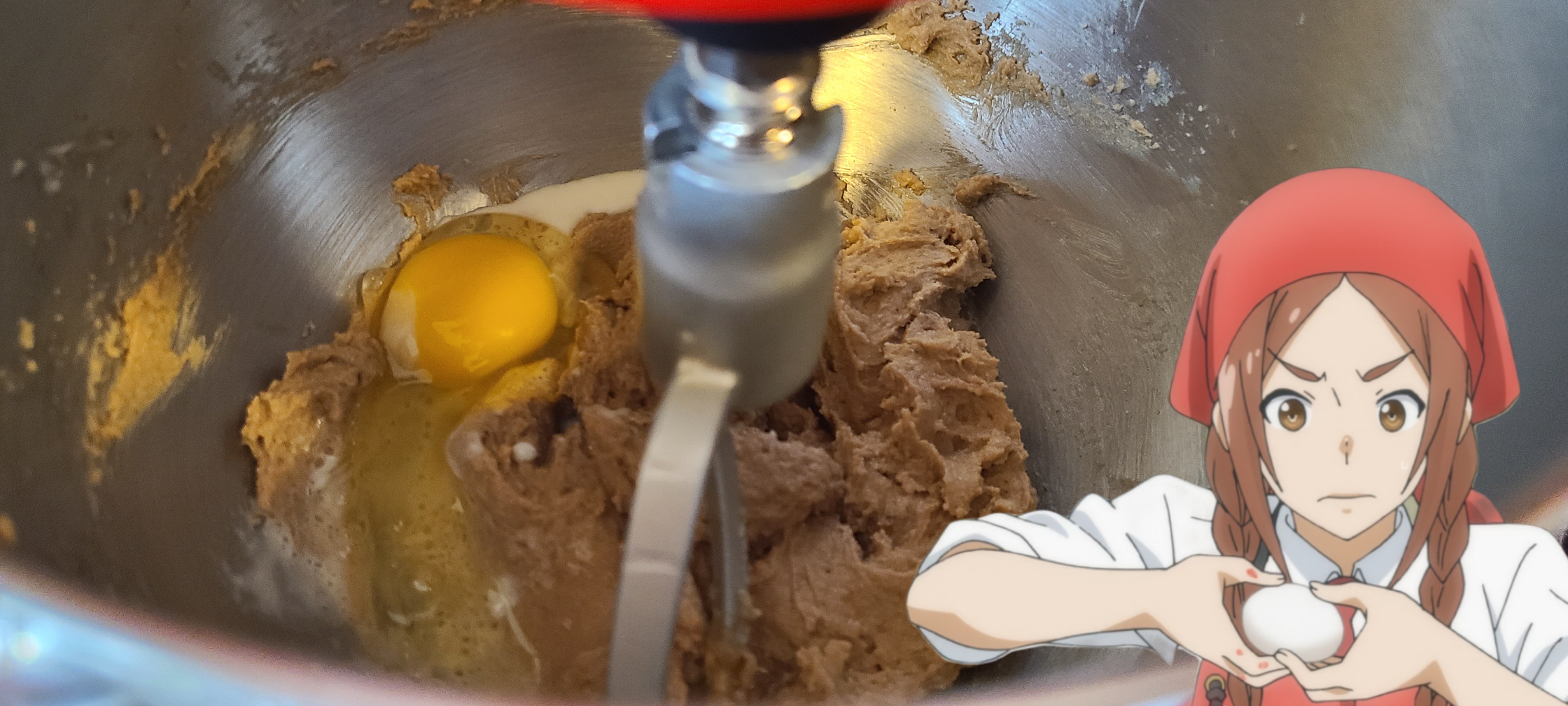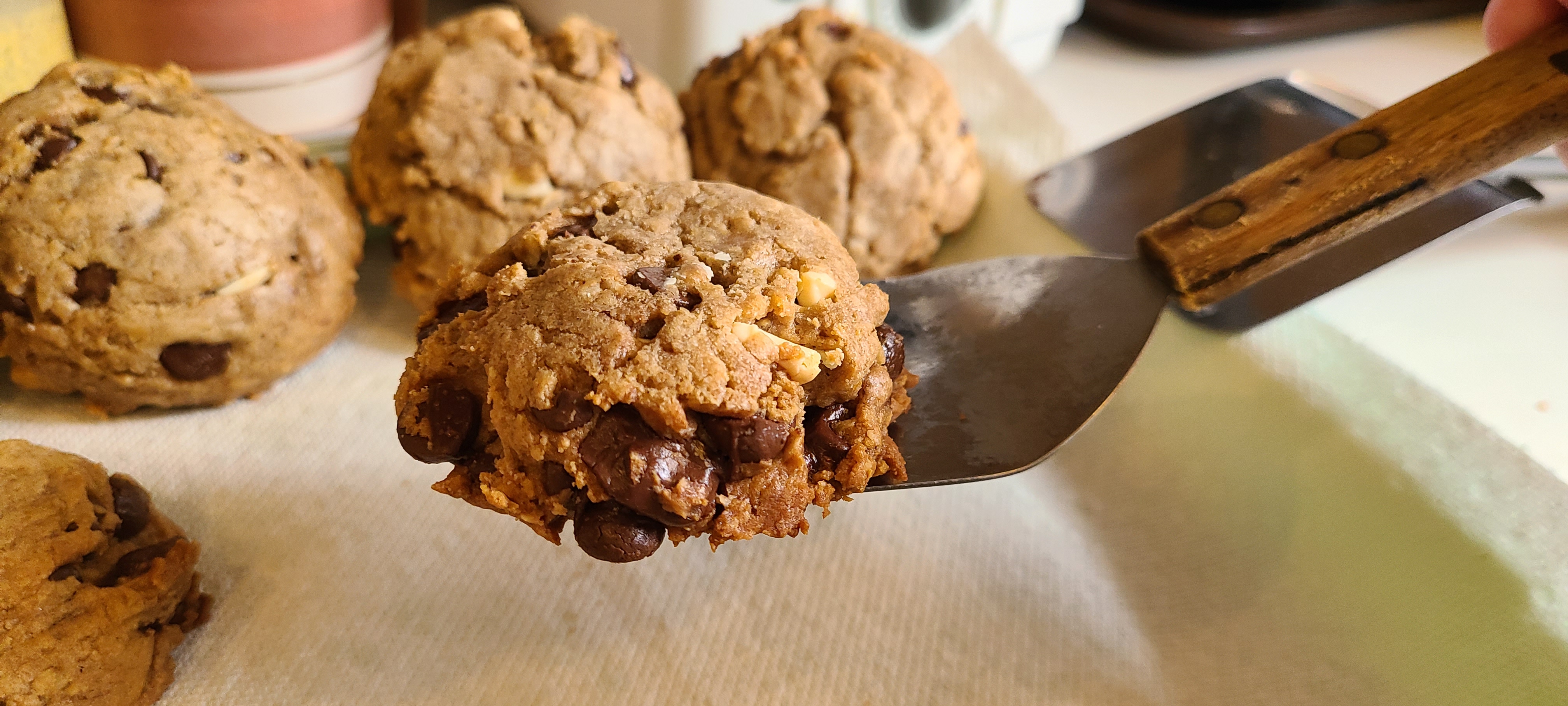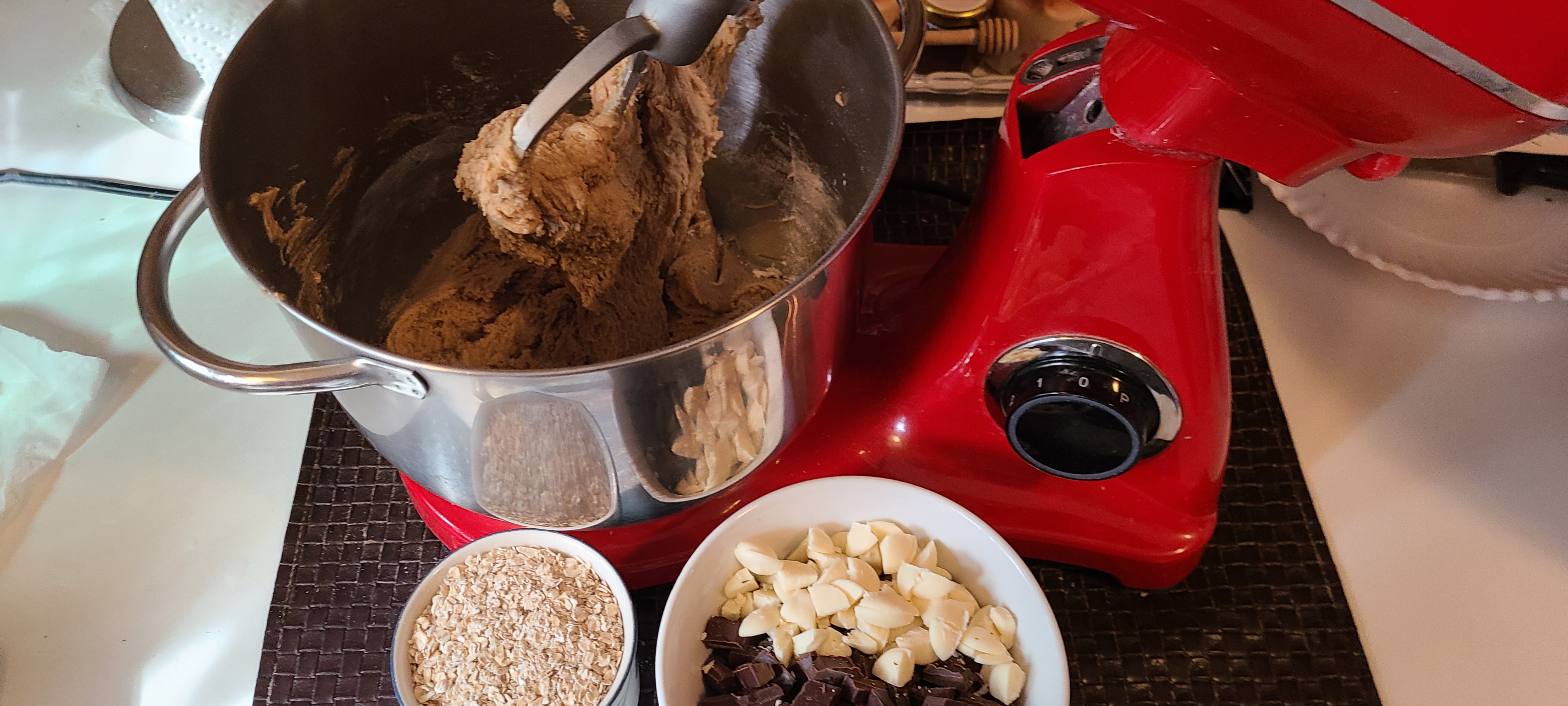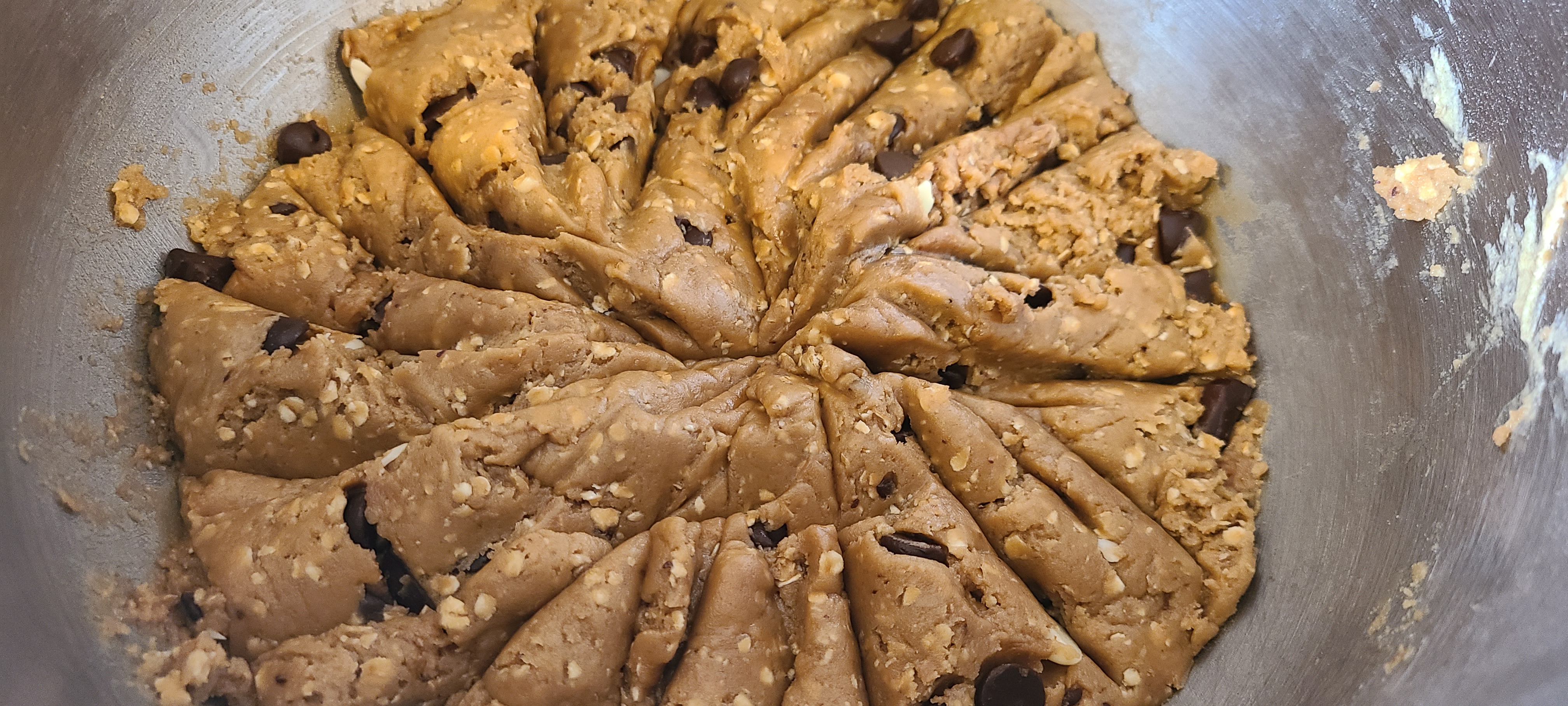 Incorporate the chocolate on low speed. I took it out of the mixer and mixed it in with a silicone spoon afterwards, as the paddle left a ton of choco chips on the bottom of the bowlLooking back, this composition is fine, but there was either a little too much flour or oats, which made it a little bit too solid, and thus it turns out a tad too dense in the end. Less of either or both of those would have resulted in a better texture in the end