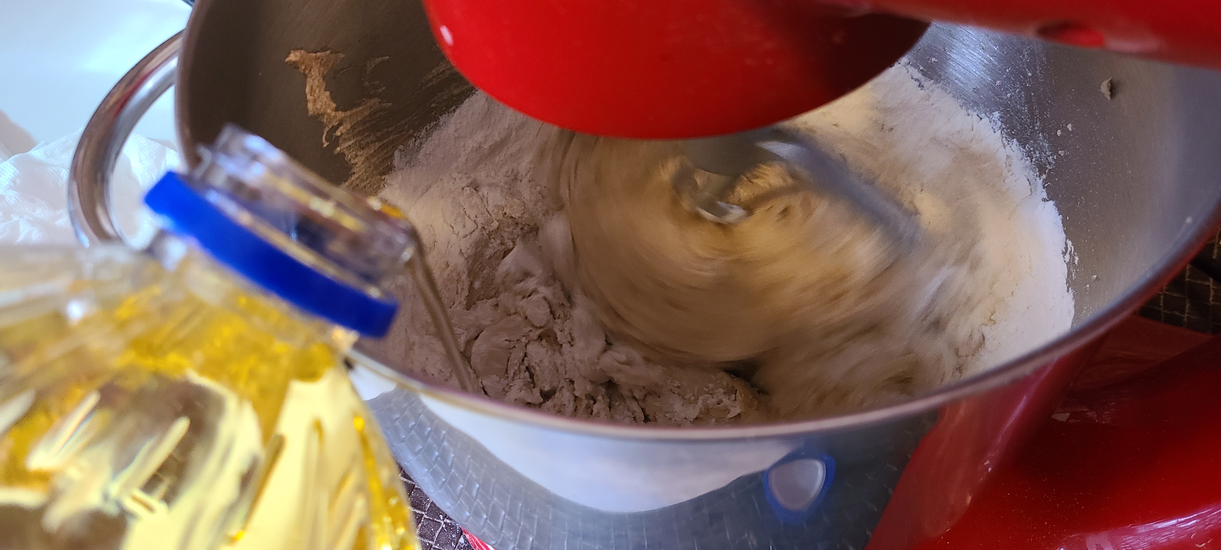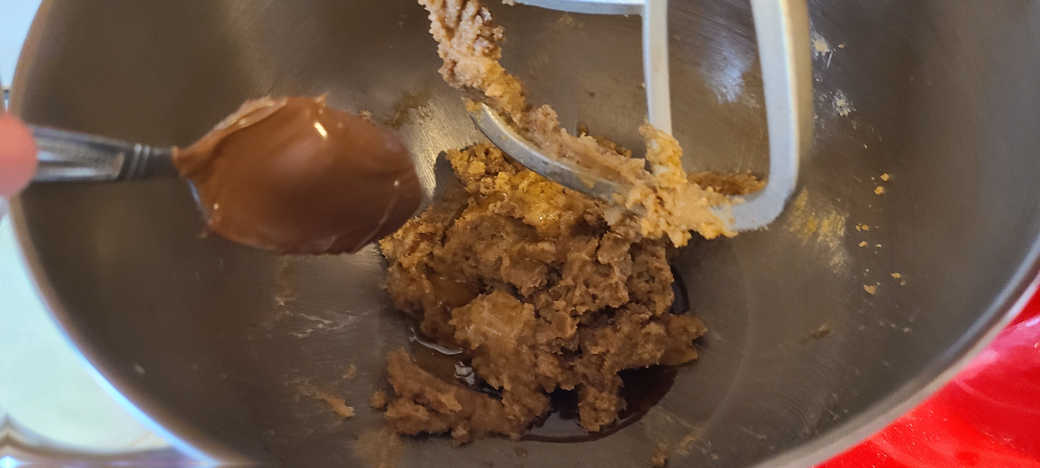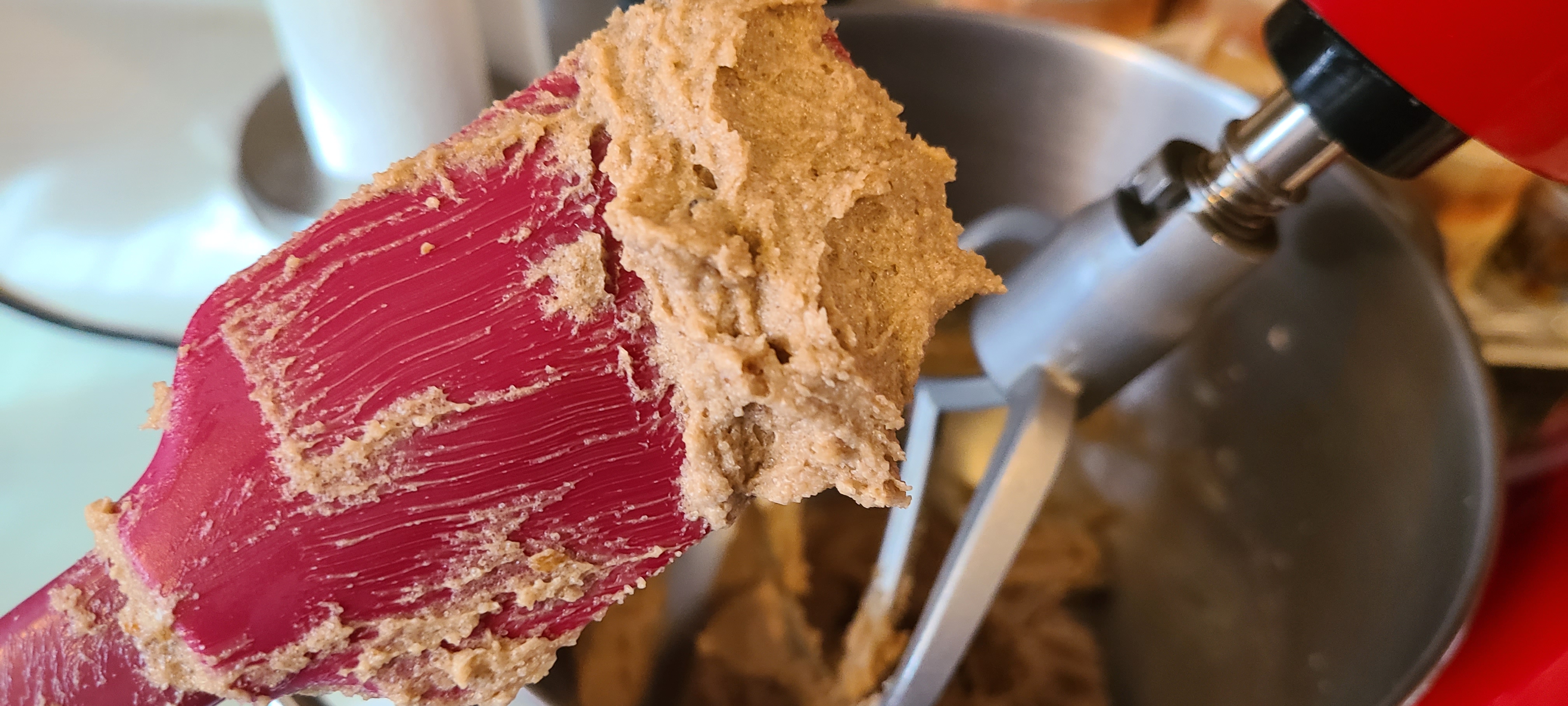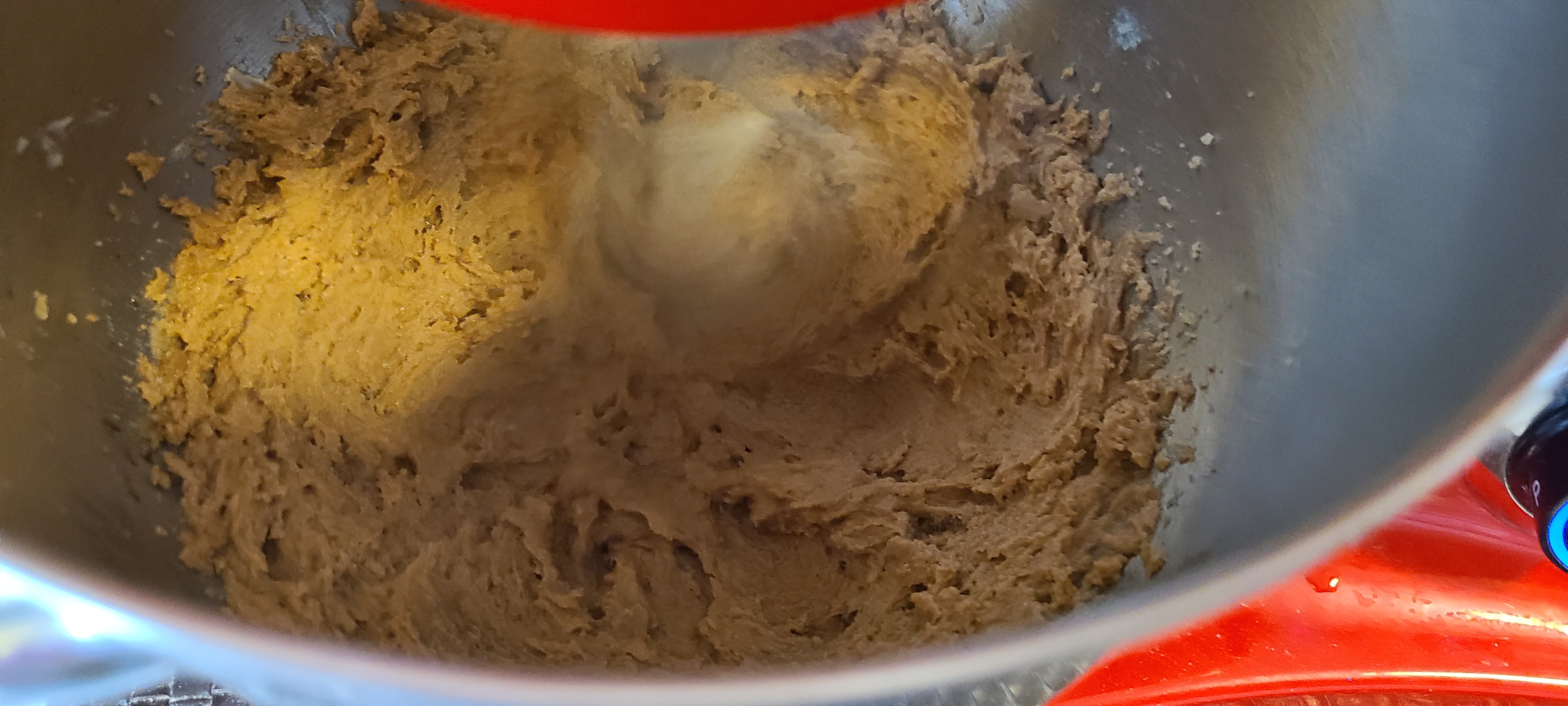 Incorporate the chocolate on low speed. I took it out of the mixer and mixed it in with a silicone spoon afterwards, as the paddle left a ton of choco chips on the bottom of the bowlLooking back, this composition is fine, but there was either a little too much flour or oats, which made it a little bit too solid, and thus it turns out a tad too dense in the end. Less of either or both of those would have resulted in a better texture in the end