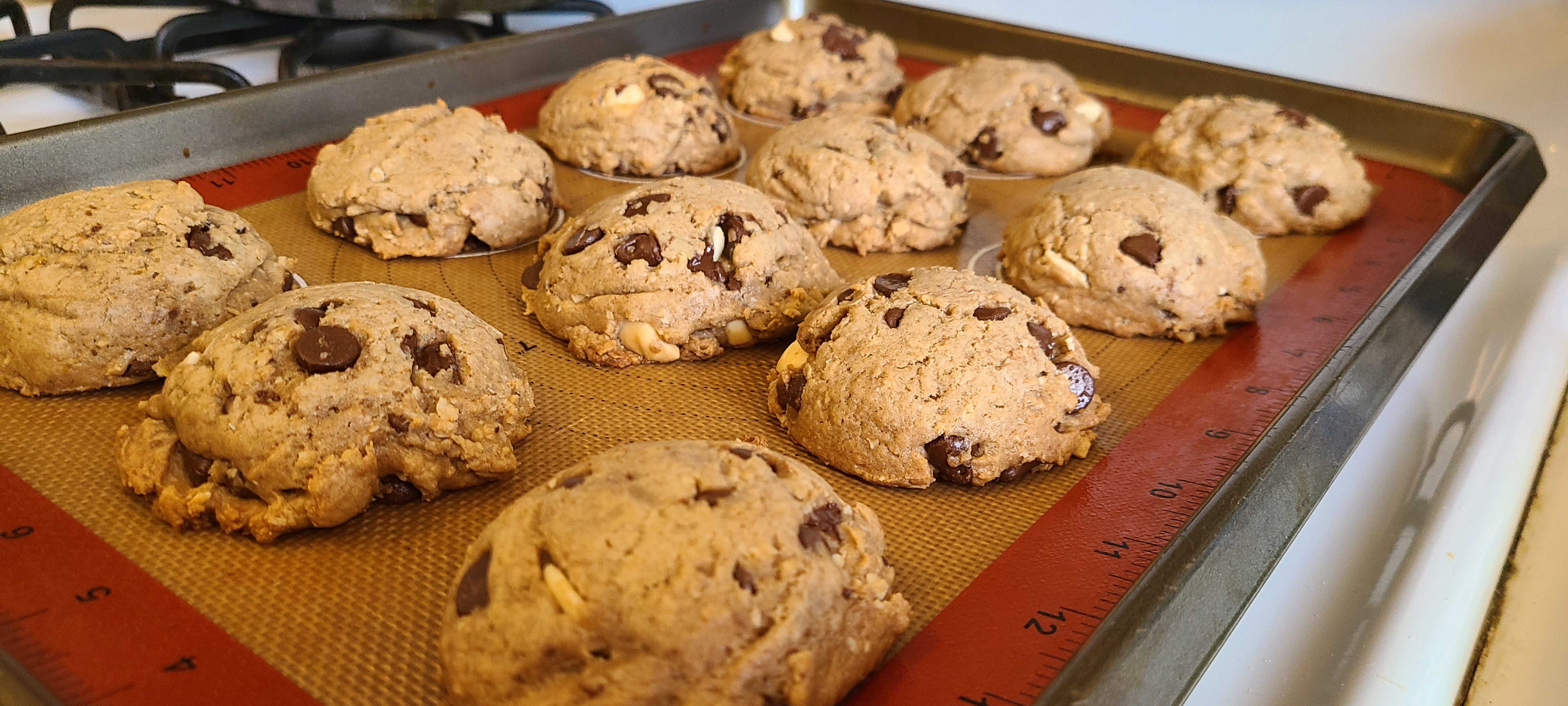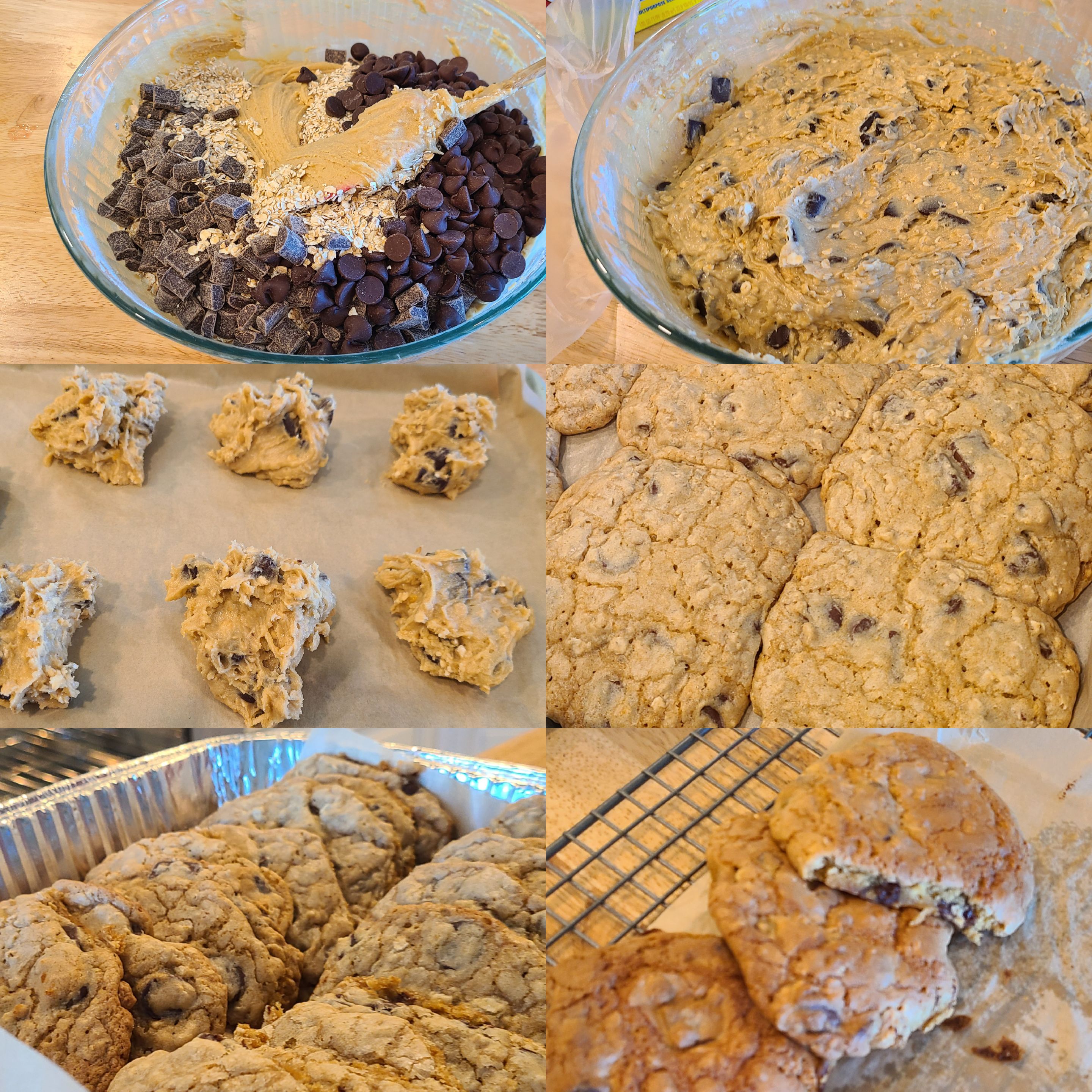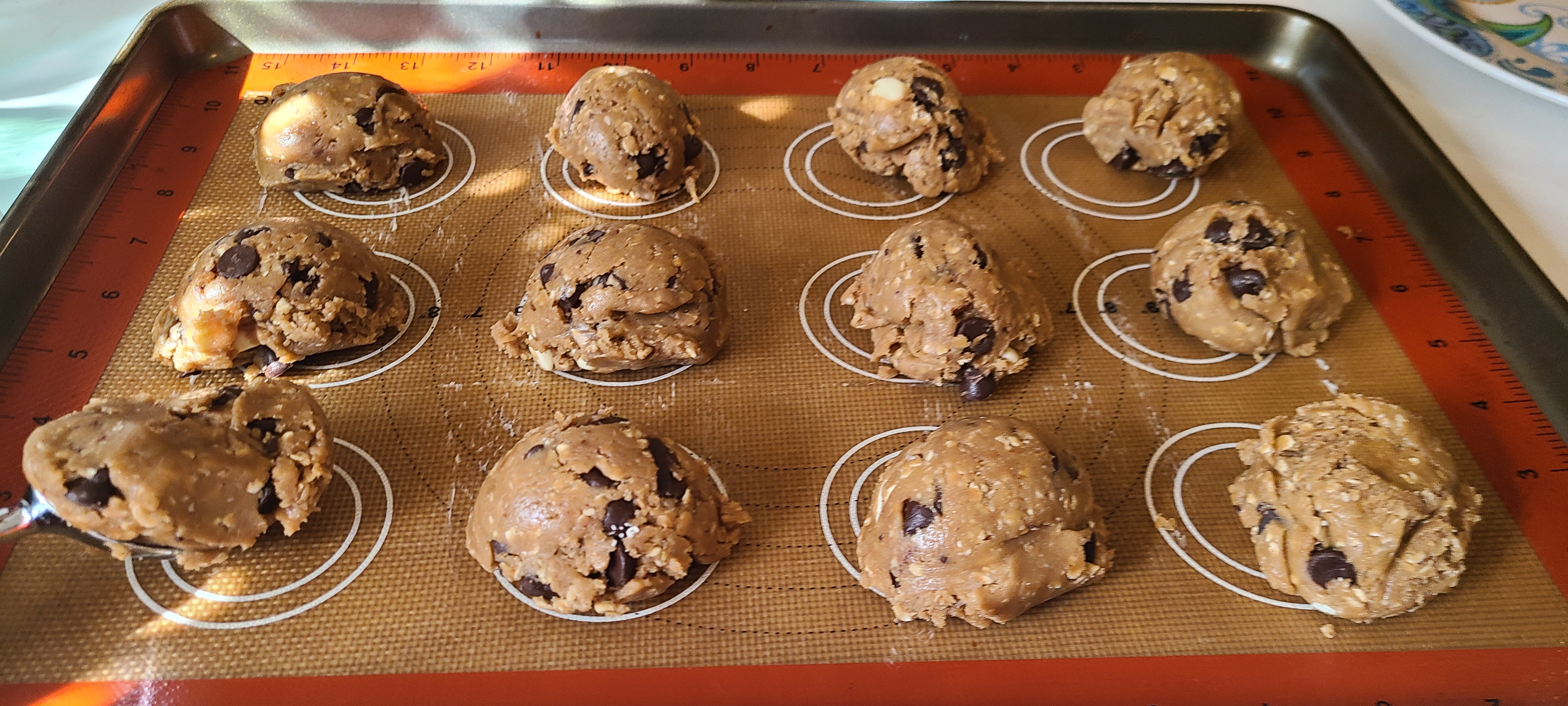 First tray doneThey're a bit tall and didn't flatten down as much as I've seen them do in the past. This is likely due to having too much flour/oats in the composition. I've made this recipe many times before and I've seen them go VERY flat. Likely just because there was less flour then. But I haven't made these in a year, so my cookie making is a little rusty