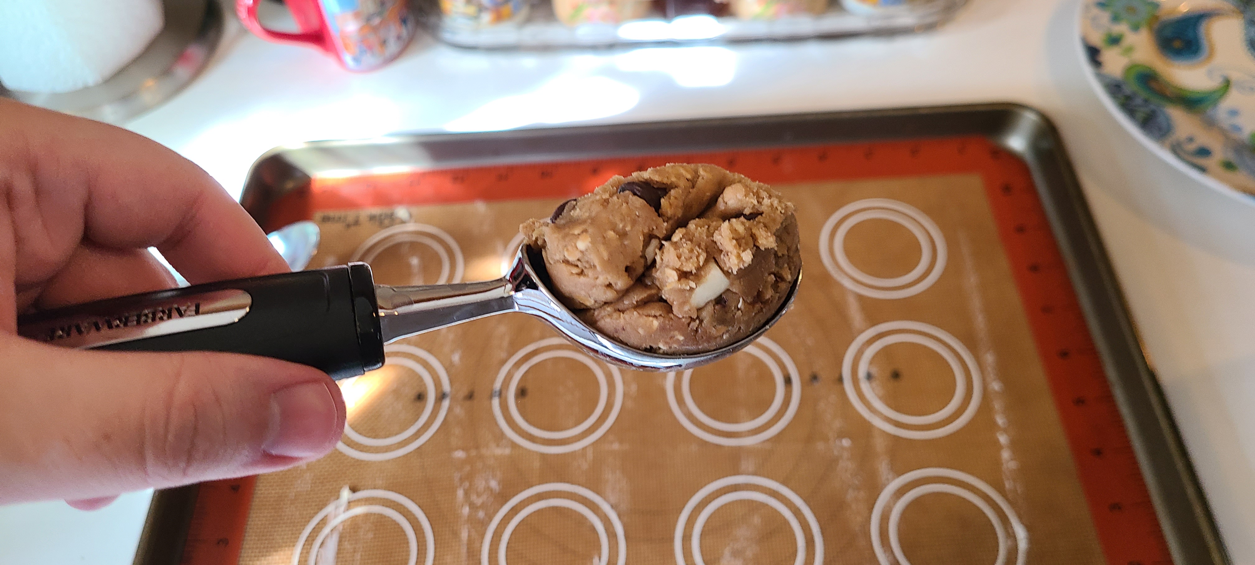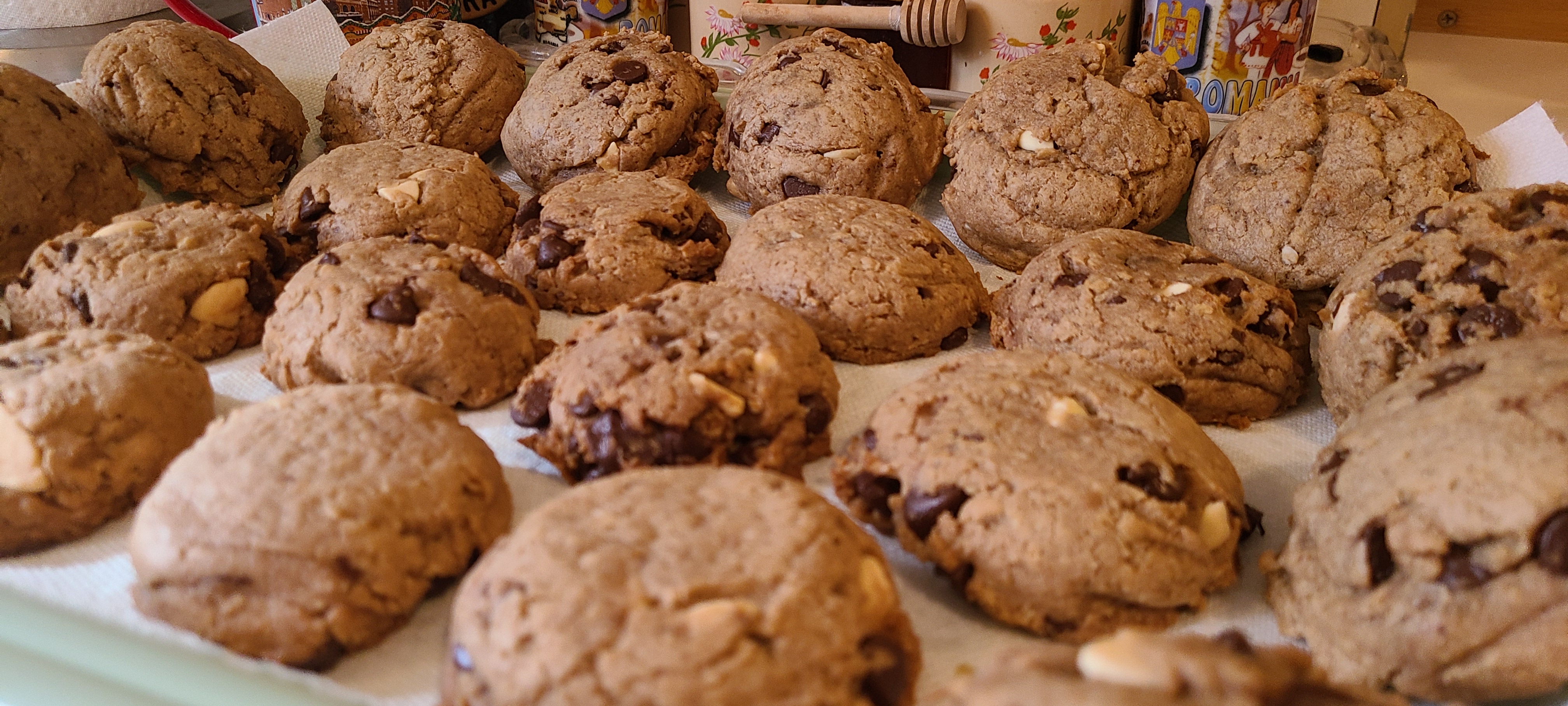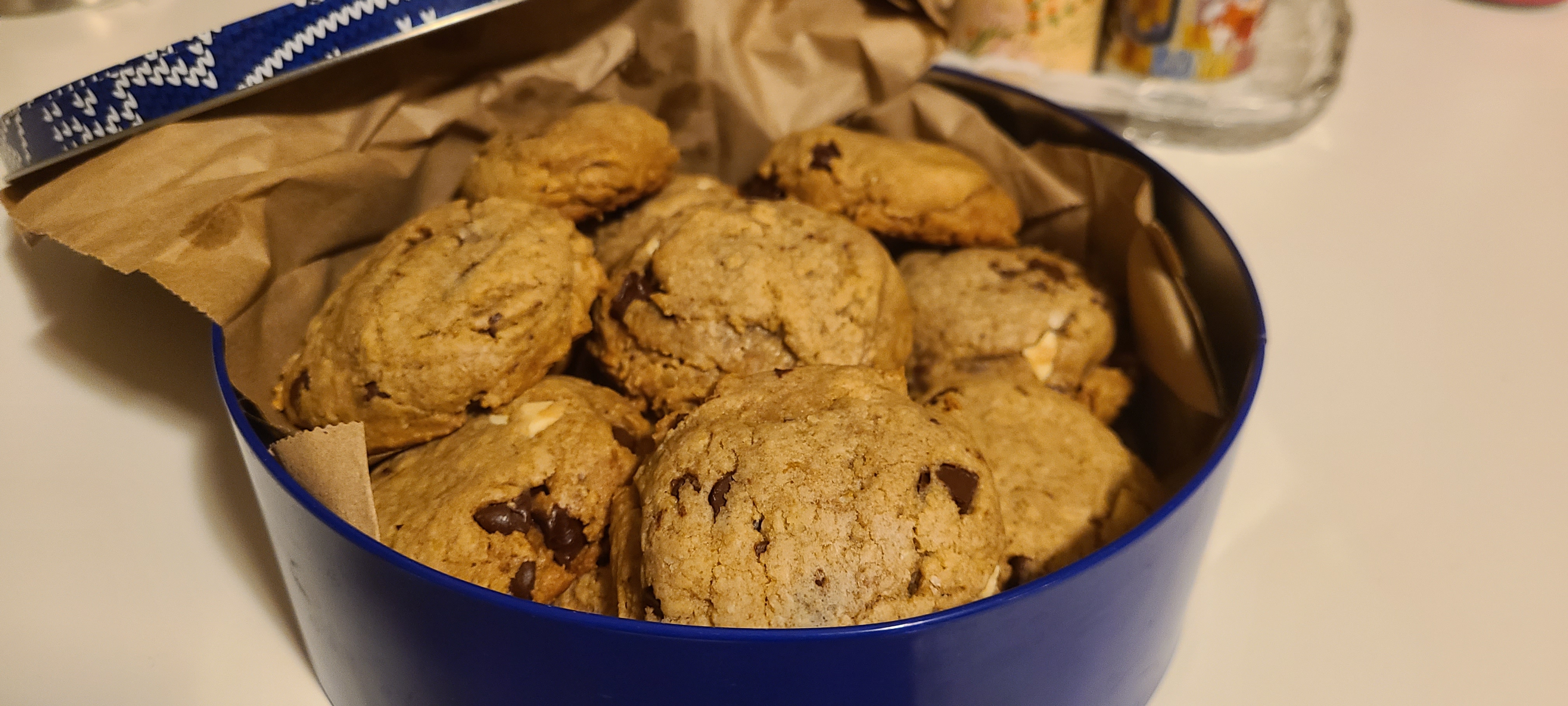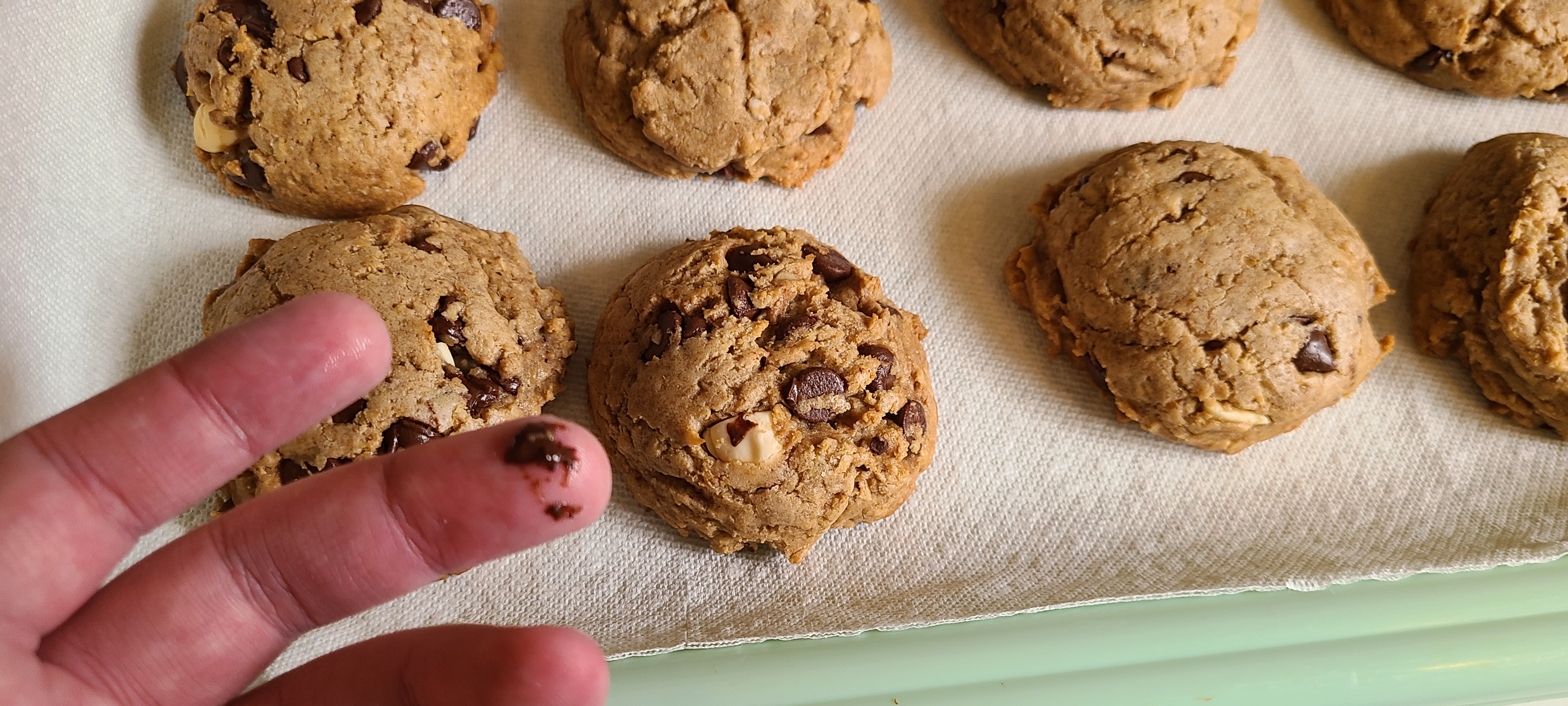 First tray doneThey're a bit tall and didn't flatten down as much as I've seen them do in the past. This is likely due to having too much flour/oats in the composition. I've made this recipe many times before and I've seen them go VERY flat. Likely just because there was less flour then. But I haven't made these in a year, so my cookie making is a little rusty
