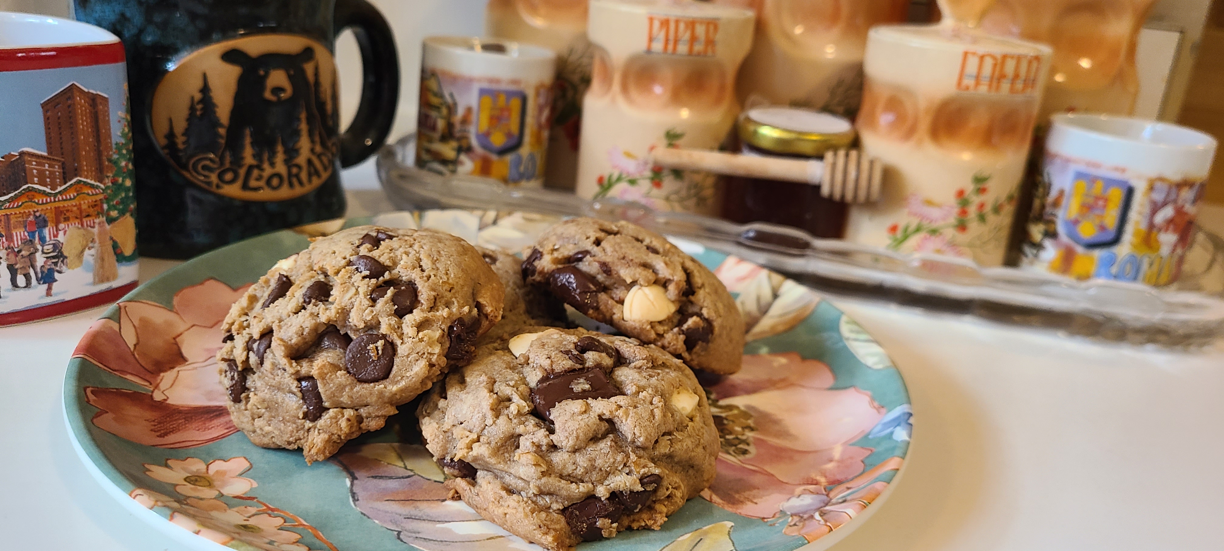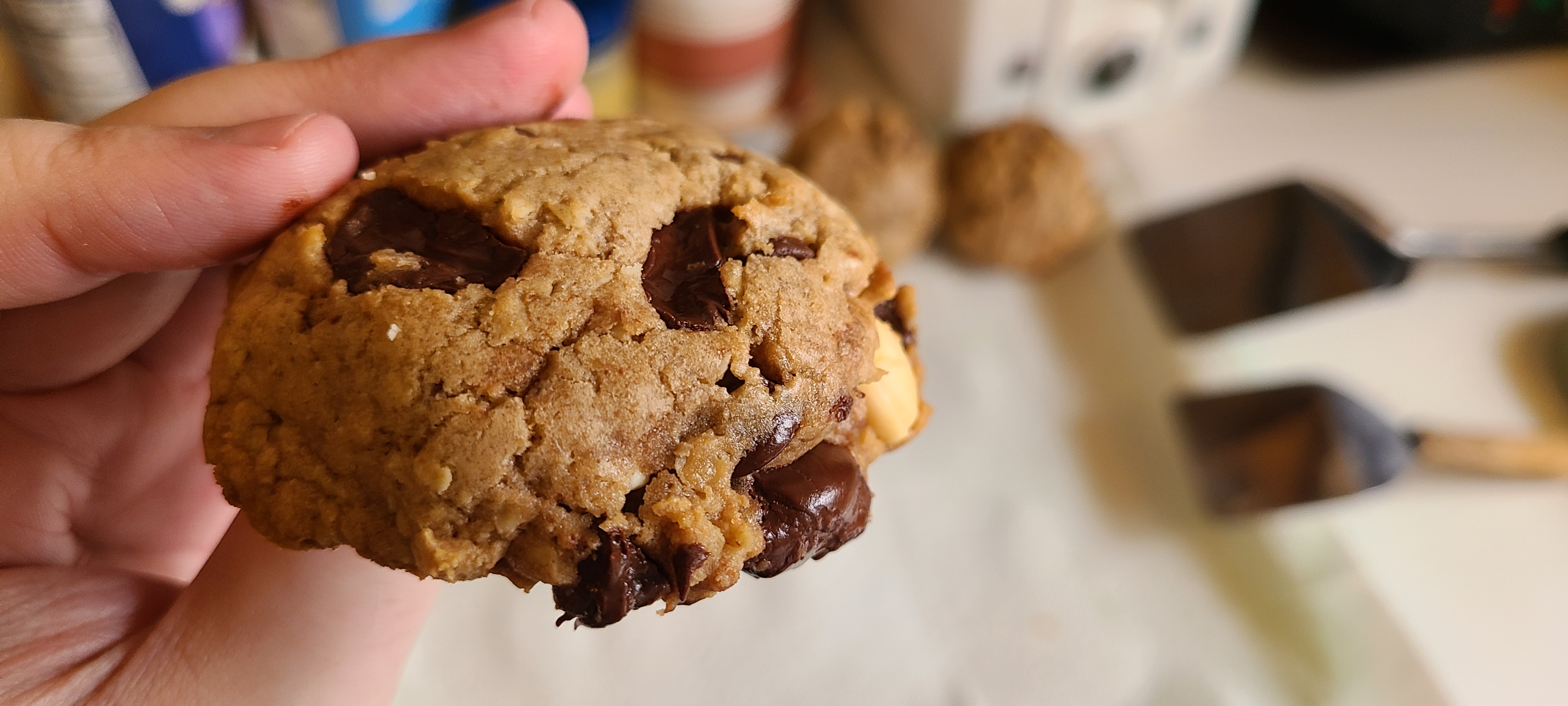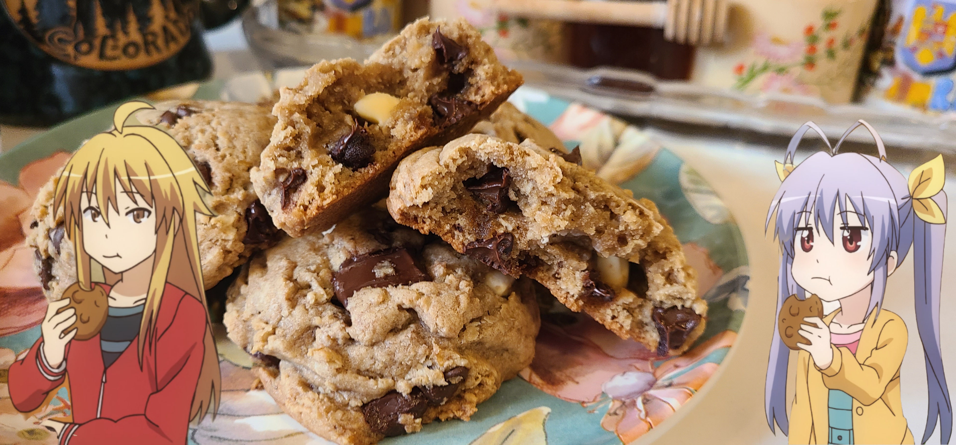 In conclusion, 8/10 batch. I've done better in the past>too much flour and/or oats caused the texture to be less soft and caused them to not flatten as much. This is just personal prefrence though, some might like the more oaty texture. I prefer them on the softer side>the secondary flavors, such as the vanilla and zest, could have been more pronounced. They were too unnoticable>the chocoalte content was perfect. This ratio of milk to dark to white is great and the chocolatey feel when you bite in is just sublime>the sweetness with 2 cups total of sugar is in the best spot. It's not overwhelmingly sweet, nor is it lacking. It's just the right amount of sweetness to leave you satisfied, especially when paired with the chocolateAll in all a very successful bakeI am ready for Frieren Friday