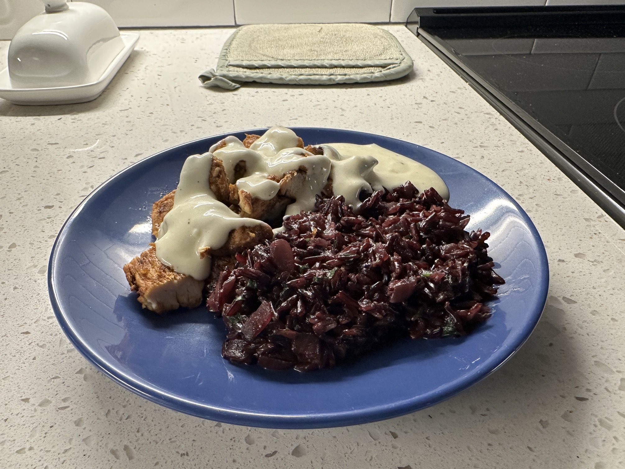 Wa la. Pretend shawarma chicken, purple lemon rice, and garlic sauce.