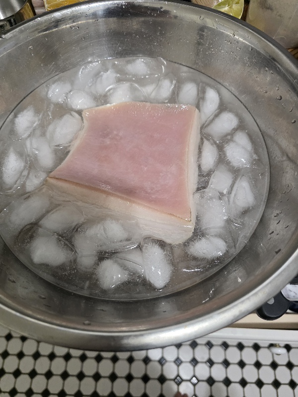 In an ice bath to cool off. Scrape some skin off. Also butcher left some small hairs which I blowtorched and scraped off too.