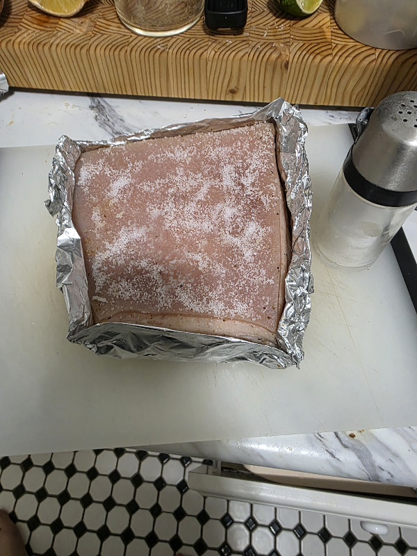 Hmmm not my best effort. The pork fat released a lot of water through the entire baking process which meant the fat never got puffy. Butcher said it was previously frozen, which may explain why.Tried a new method this time where there isn't a thick layer of salt covering the fat. Had to broil, which resulted in some burnt and uneven spots, even when I protected certain areas with foil. Biggest mistake was probably trying to food torch some spots which resulted in the black spots on the bottom right.The internal temperature (incl carryover) was spot on though, so sure it'll be delicious. Is missing the classic fat color which is a shame.Going to rest for an hour. Will try to get pics when it's served.