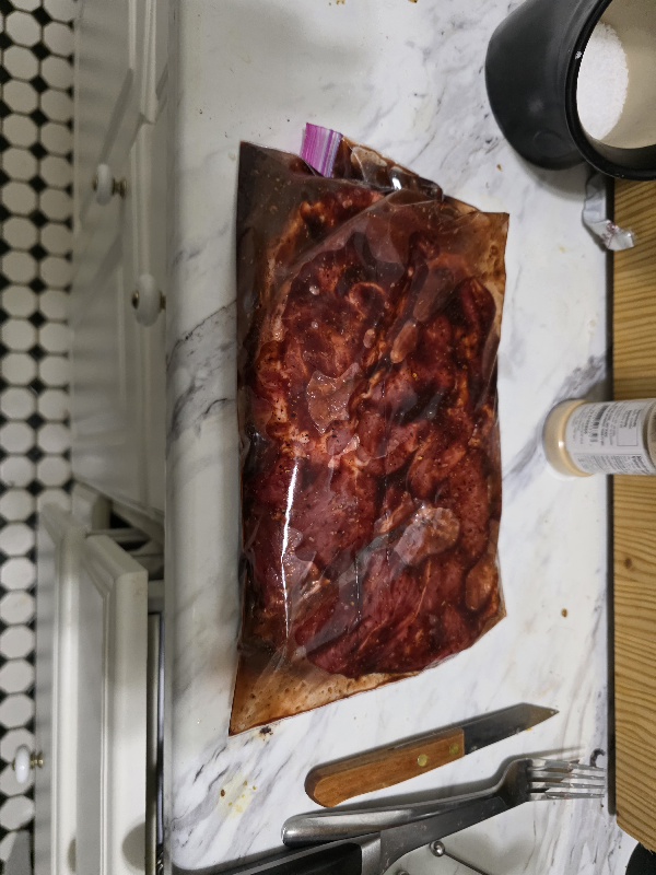 Marinade: wine, salt, brown sugar, five spice, garlic powder, bean paste, soy sauce, oyster sauce (which I actually forgot and am going to add now), hoisin sauce, and a few drops of food coloring.Going to marinade overnight. See everyone in 16 hours or so when I start to cook... Though it's basically just chucking it in the oven and all pretty simple.