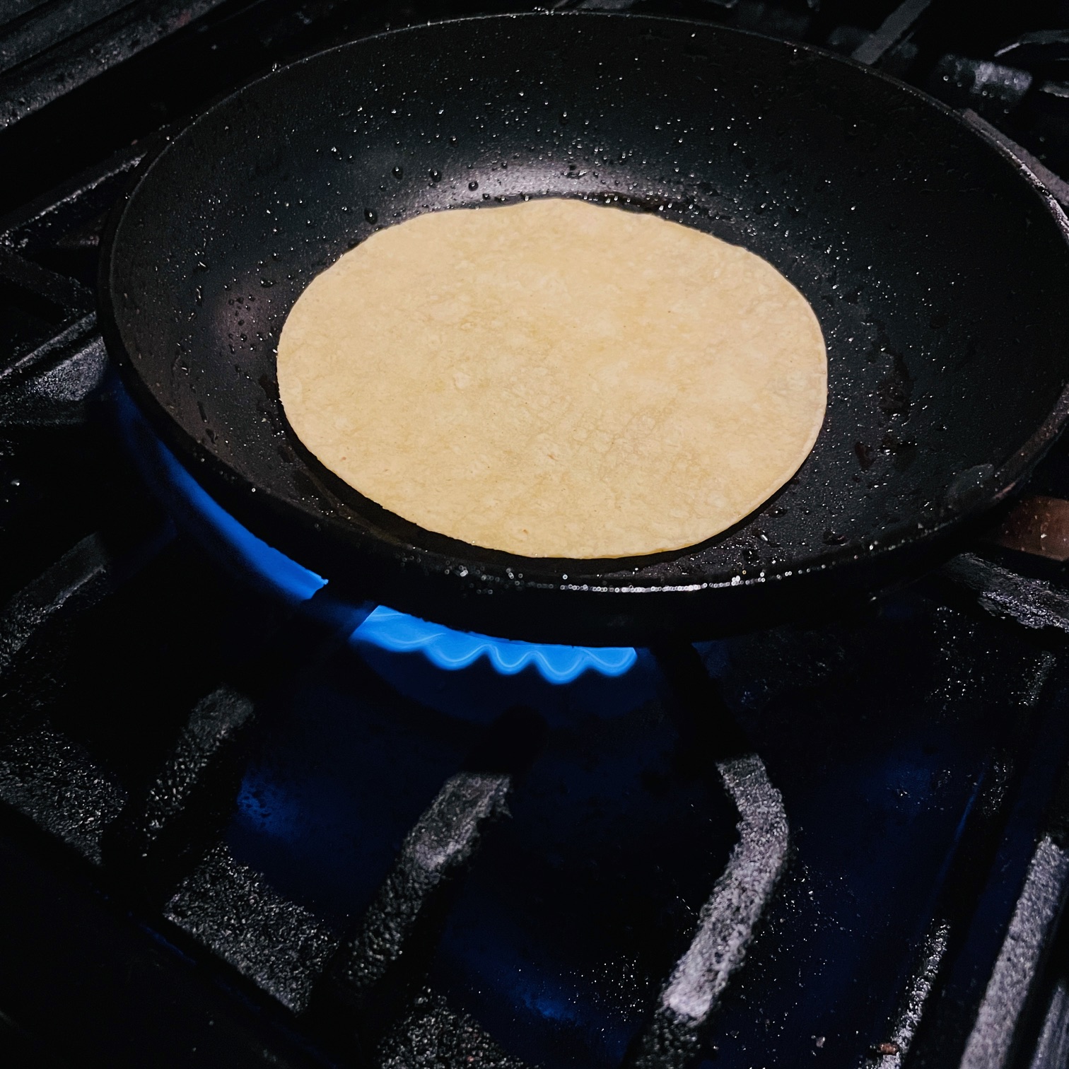 I'll first crisp up this tortilla in the beef fat left from the steak I cooked in the pan last night.