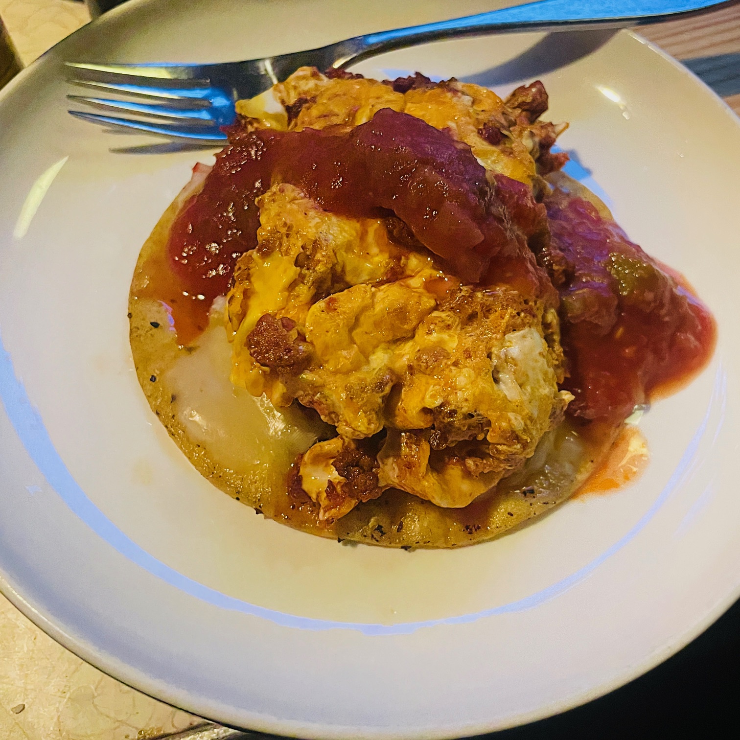 Finished with Hot Pace Picante Sauce, one of my favorite condiments in the world. Looks okay for the big mess that it is. And I assure you it's delicious. Not too little, not too much, everything just right.