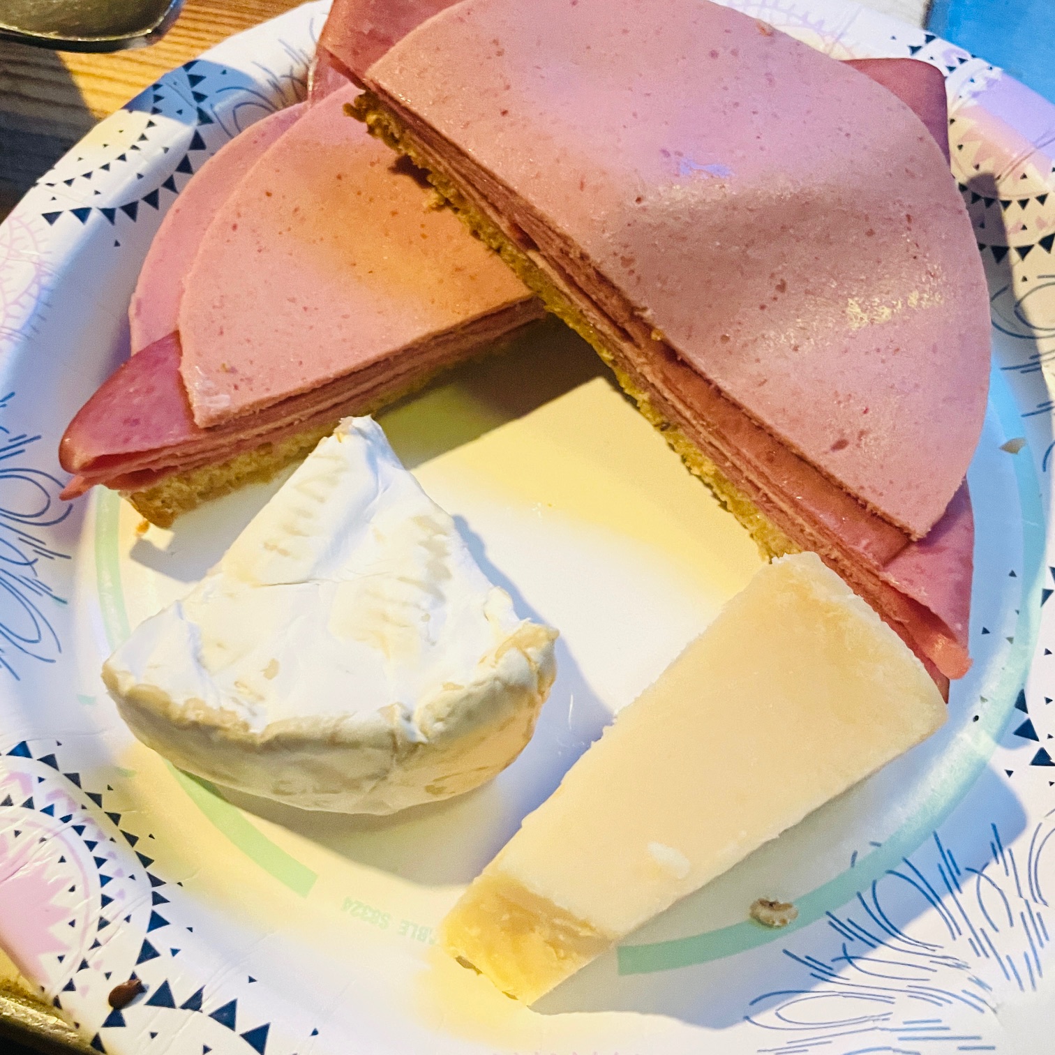 Second breakfast. Actually I wrapped this up for later. Pastrami and bologna on multigrain bread with mayonnaise and horseradish mustard. Parmesan and brie. In a couple hours it will be a delightful room temperature and ready to eat.