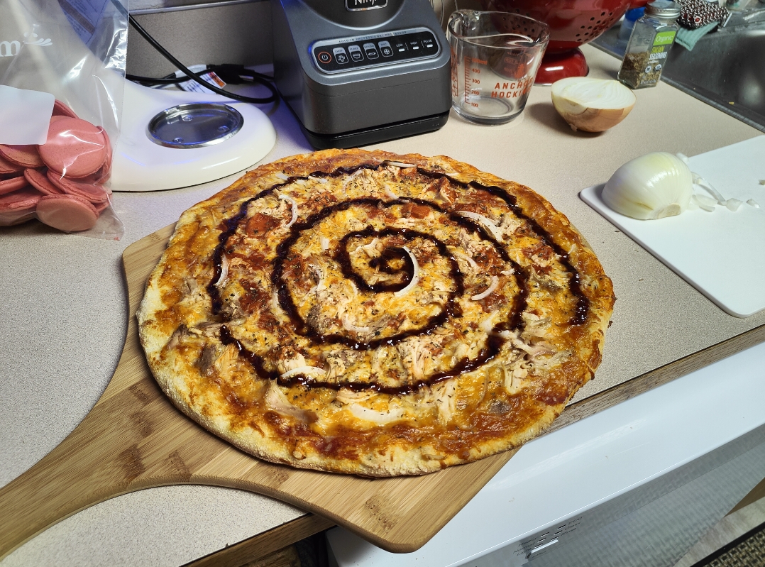 >>21916819>>21916822Oh and make sure to season it before use otherwise it'll stick. Or skip seasoning and just blast it with nonstick spray before you put the dough on.>Pic related a bbq chicken pizza I made last night using homemade dough and a pizza screen. I use the peel to pull it out of the oven and to cut on.