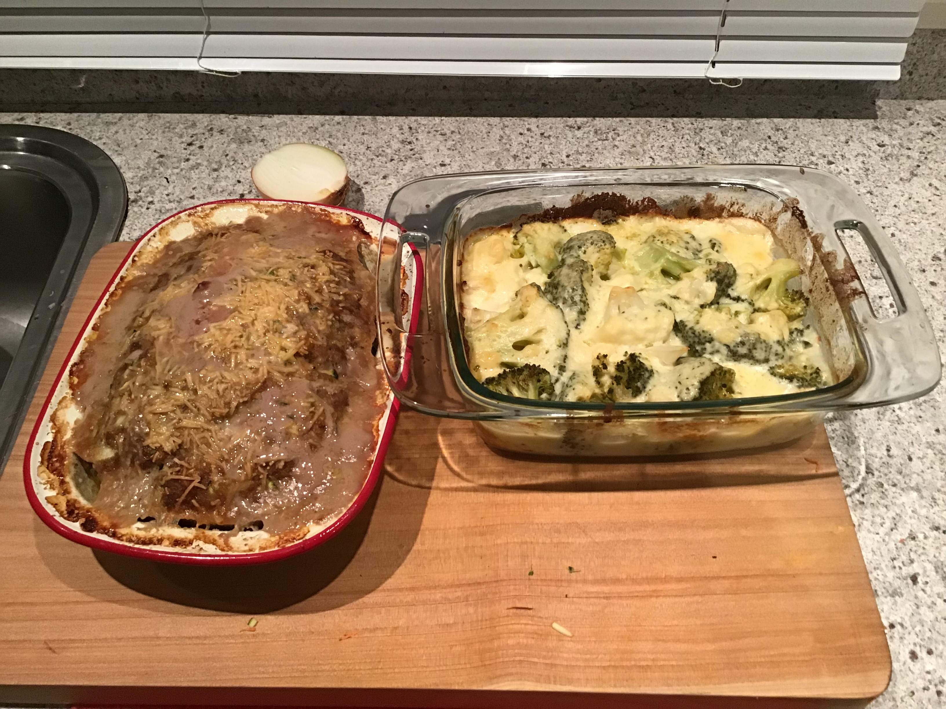 Veg-filled meatloaf and broccoli cauliflower cheese