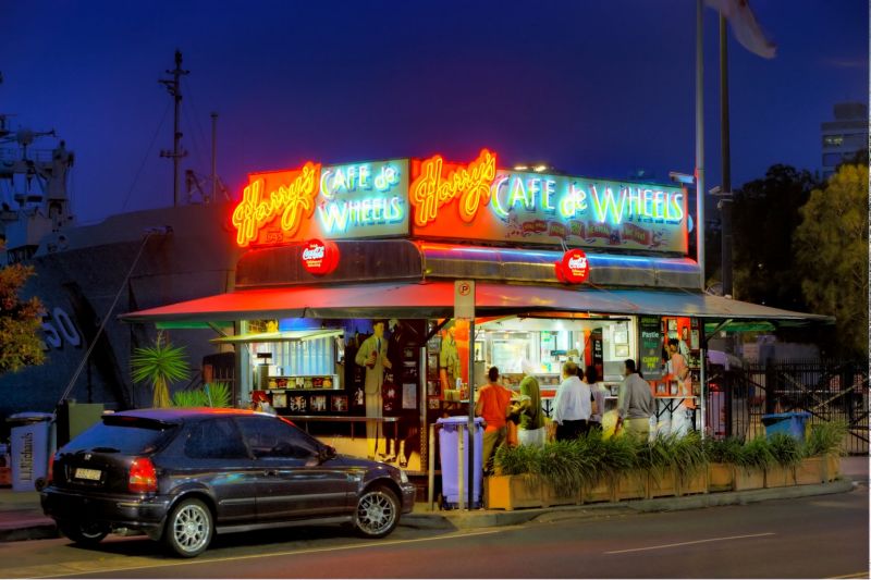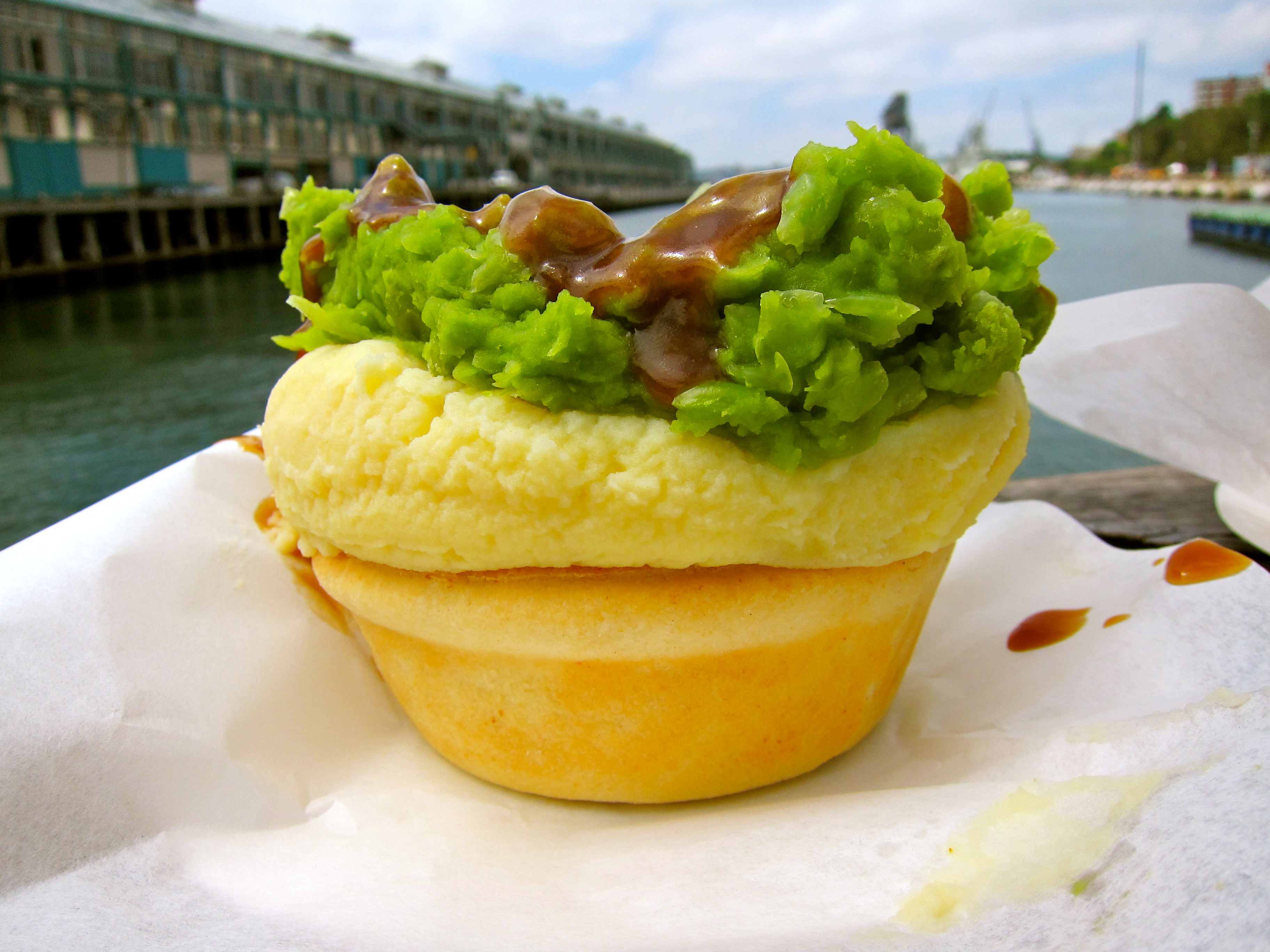 Harry's Cafe de Wheels in Sydney. It started out in 1936 as a wagon selling pies and pastries to sailors on the docks nearby (to this day, you can always see warships right outside the store). It's open till late every night of the year and famous for steak and mushroom pies topped with potato, mushy peas and gravy.