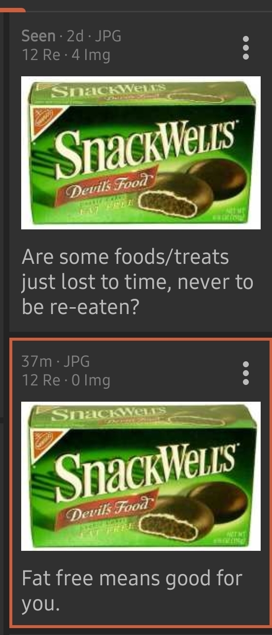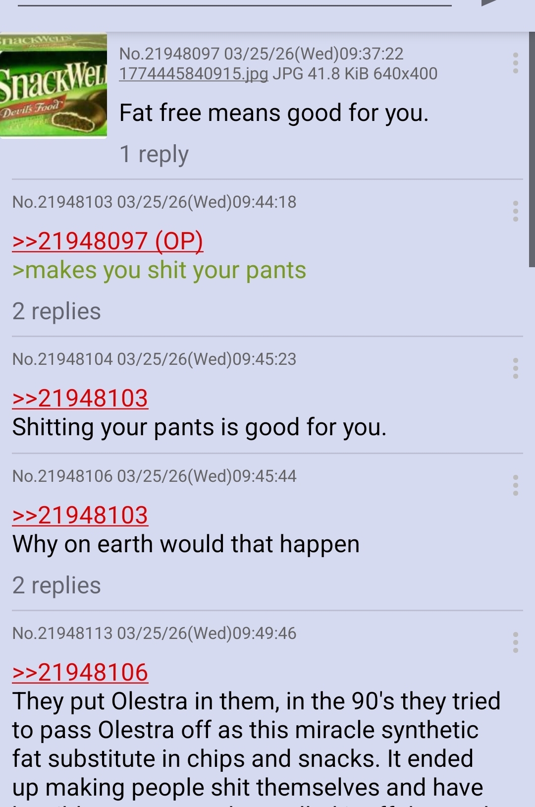 >>21948113Olestra was mostly used in chips. This didn't have it, it just didn't use any kind of fat or fat substitute at all. I remember eating it and it just tasted like chocolate bread. It kind of sucked.